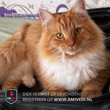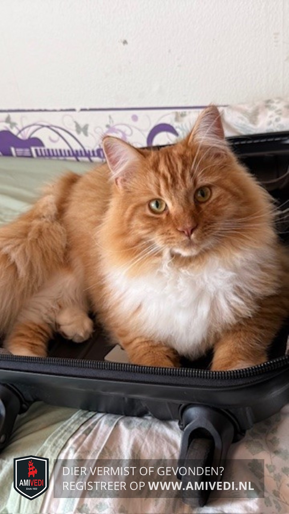 | Signalement | Langharige rode kater met grote kraag, witte kin, borst, buik en witte teentjes. Vage cyperse aftekening. |