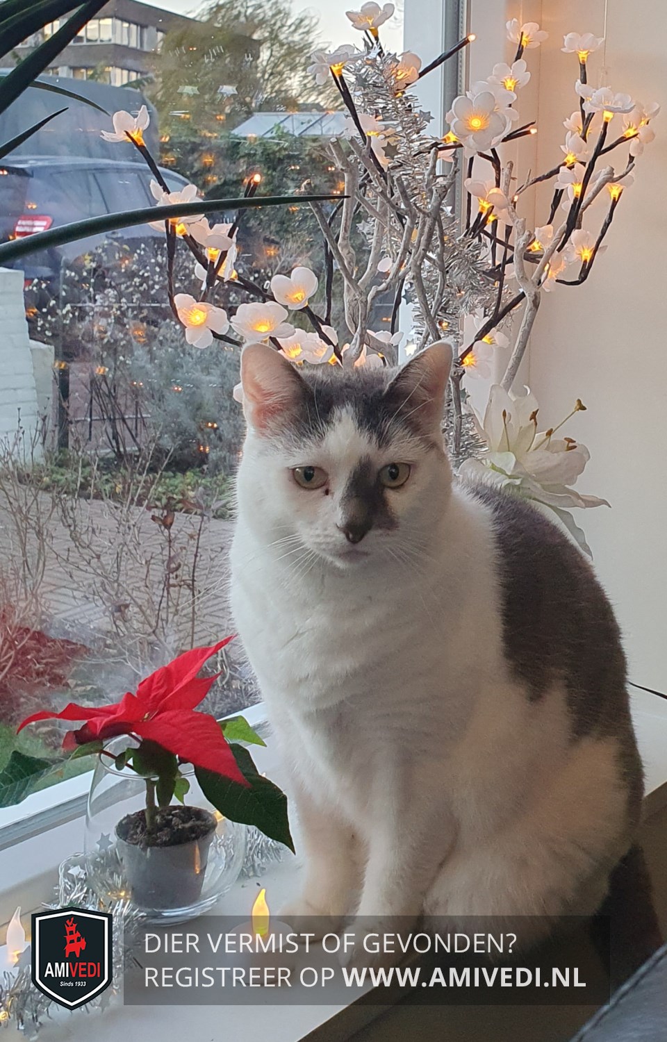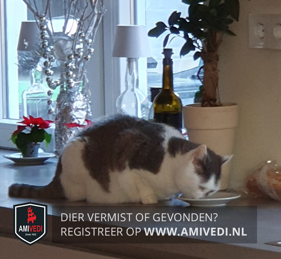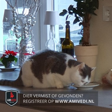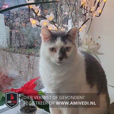 | Signalement | Wit/grijs. Wit gezicht met een grijze (driehoekige) vlek op en links naast de neusbrug. Witte bef en borst. Witte voorpoten. Grijs rond de oren. Grijs (vage cyperse tekening) op de rug. Grijs gestreepte cyperse staart. |