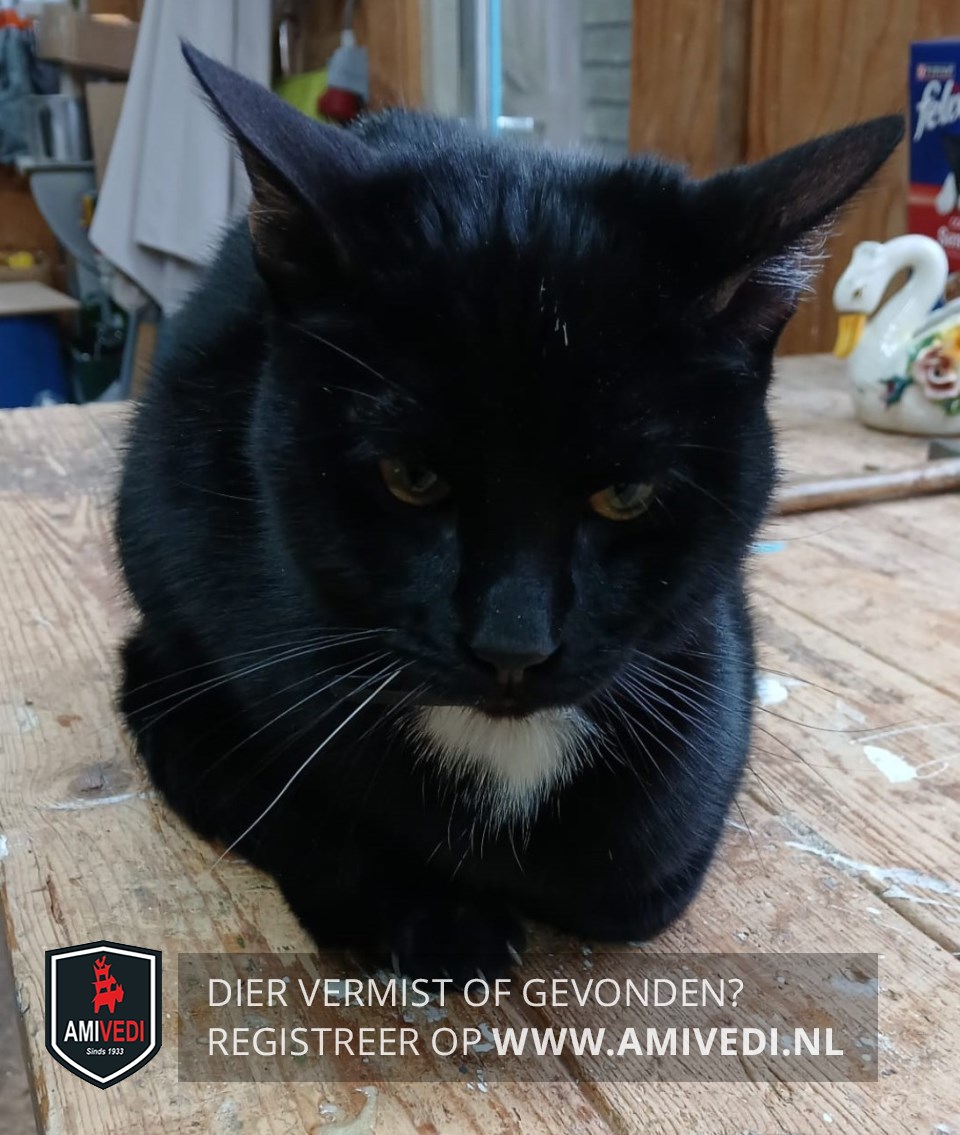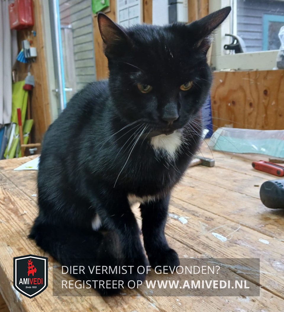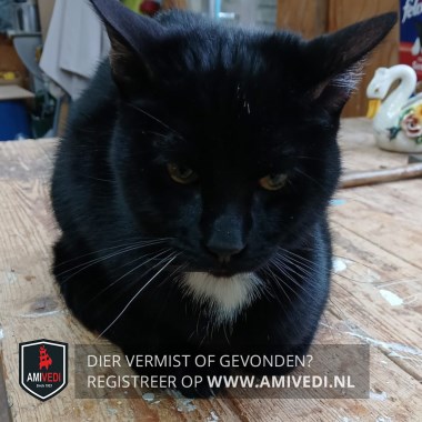 | Signalement | Zwarte poes. Witte bef. Witte haartjes op de buik. |