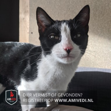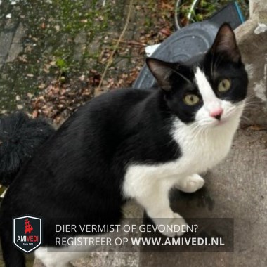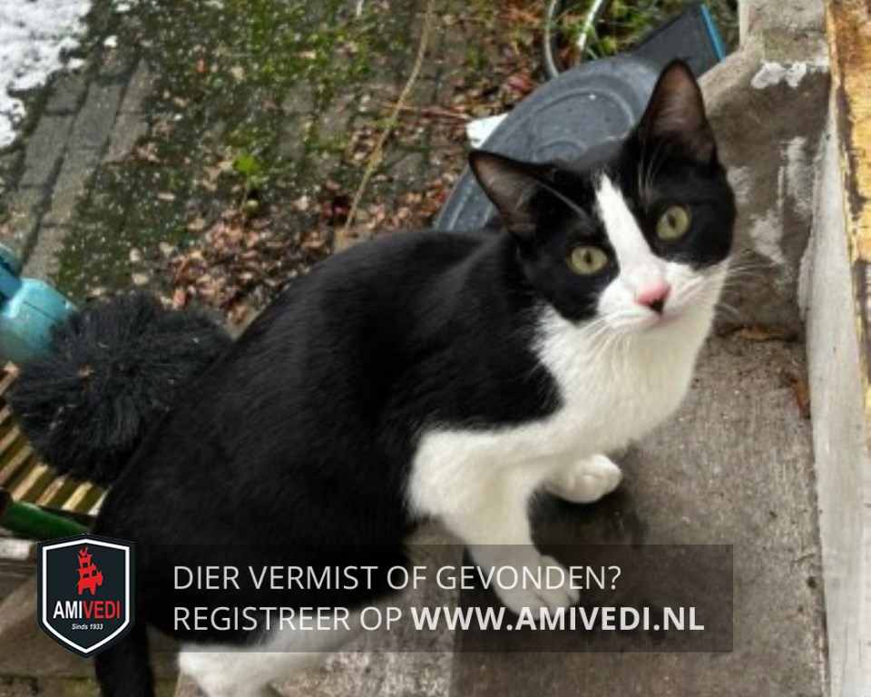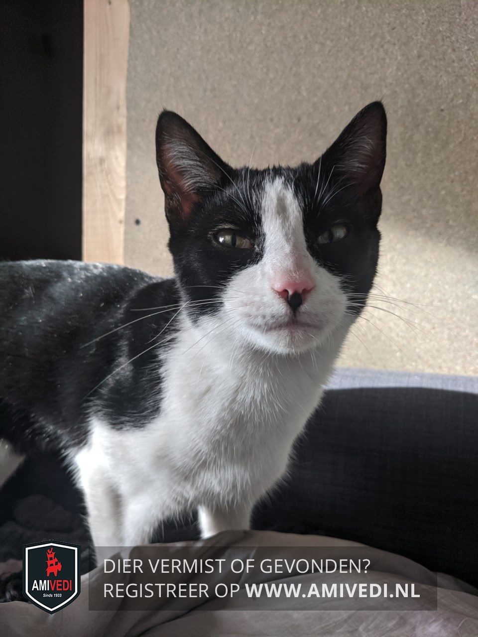 | Signalement | Zwart/witte ongecastreerd katertje. Zwart op het kopje dat doorloopt over en langs de oogjes, beetje over de wangen. Brede witte neusbrug. Roze neuspunt met een zwart vlekje, wit rond het bekje. Witte hals, borst, buik en poten. Zwarte vacht op de rug en flanken. Zwarte staart. Witte linker achterpoot met een zwart vlekje. Draagt een zwarte halsband met een wit botje. |