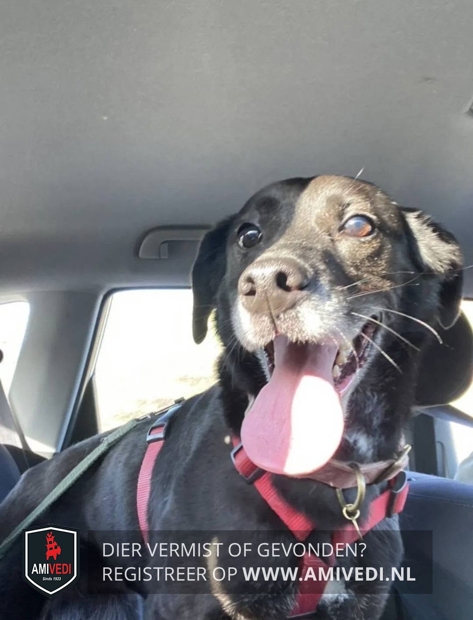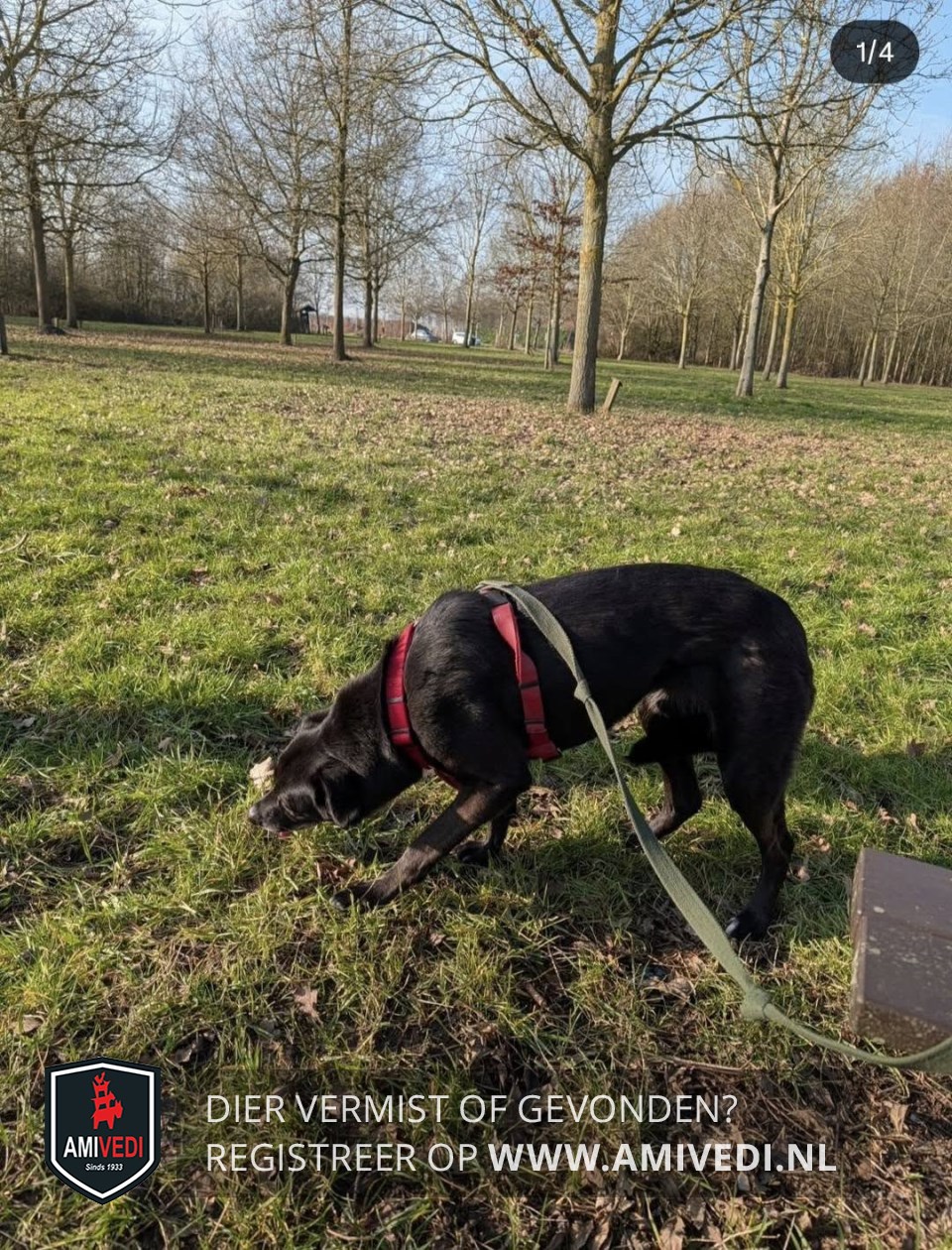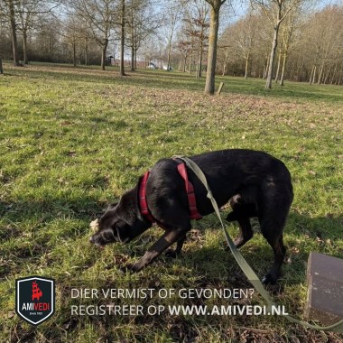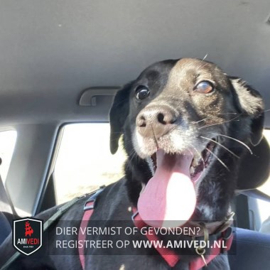 | Signalement | Zwarte hond met spitse neus en flaporen, ze heeft een witte snuit, ze draagt een rode halti en groene riem, ongeveer 20 kilo |