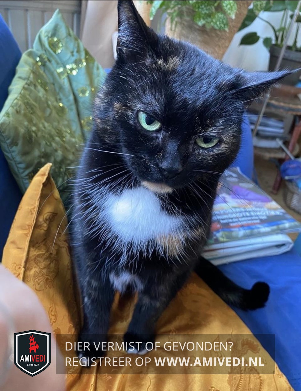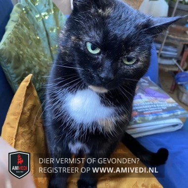 | Signalement | Schildpad poes met wit. Schuw. Heeft witte borst en buik. Witte teentjes voorpoten. |