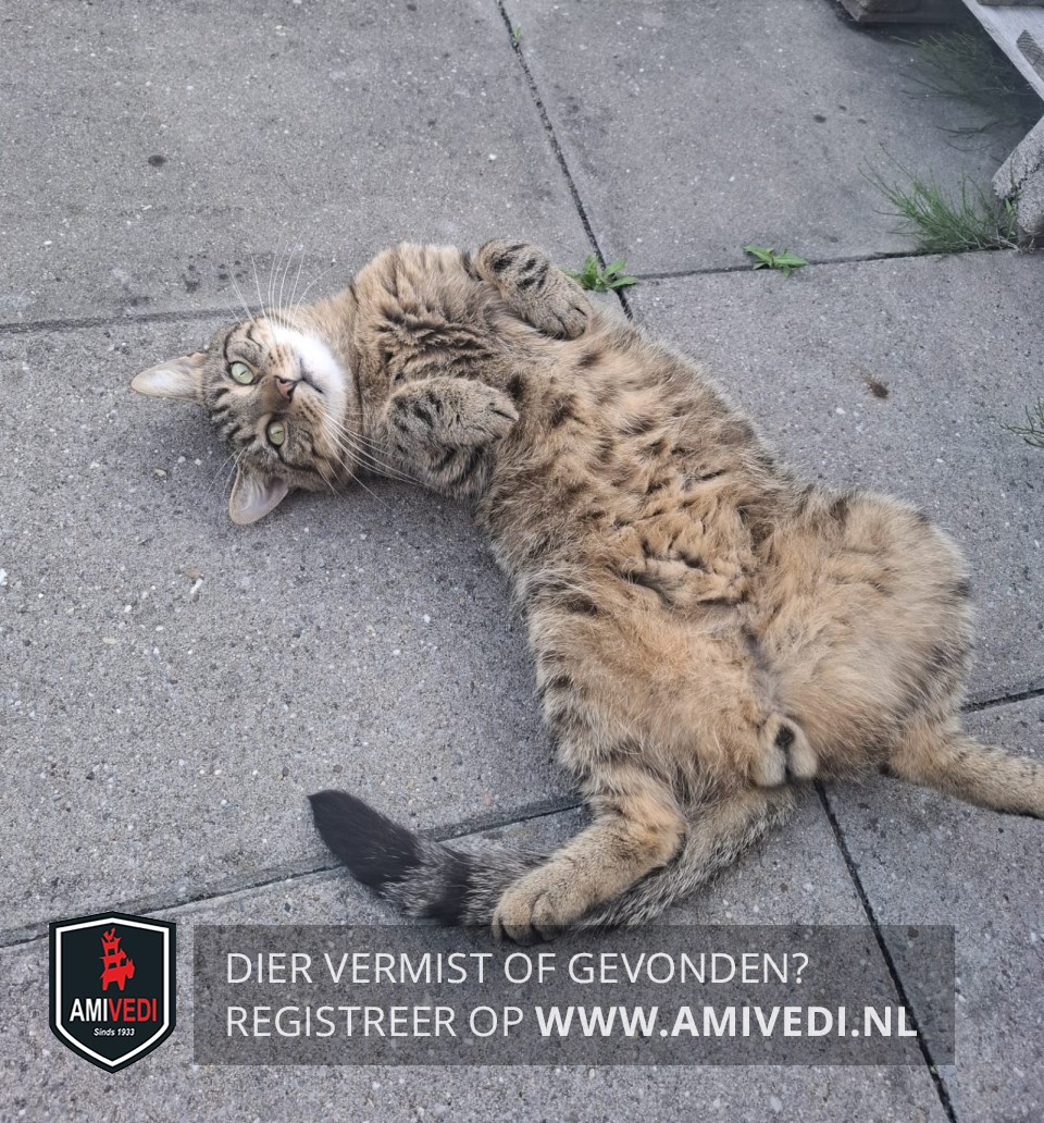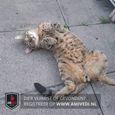 | Signalement | Cypers bruin/zwart met een witte kin. Kleine kater. Hij heeft op zijn rug een litteken van een operatie. Dit is nauwelijks te zien maar wel te voelen. Zeer aanhankelijke kat. |