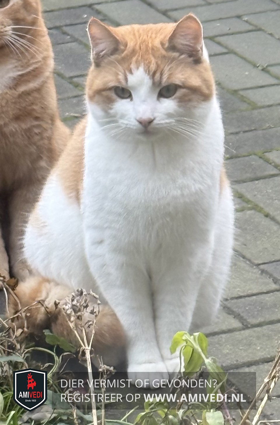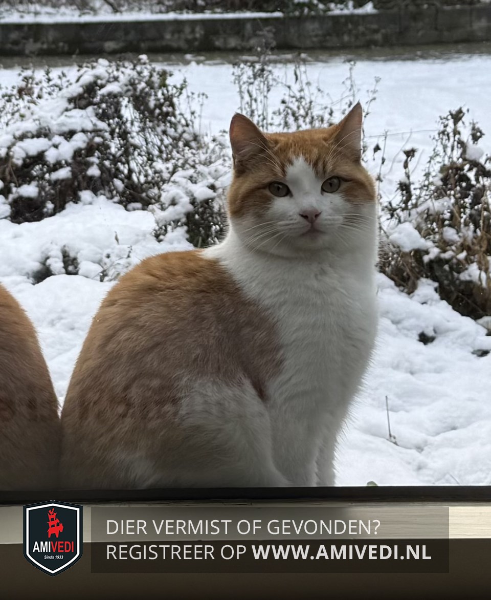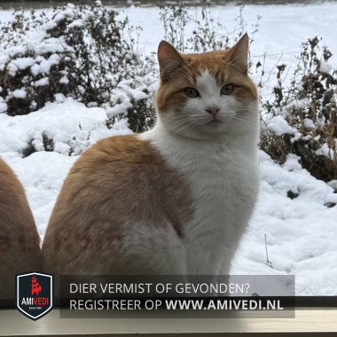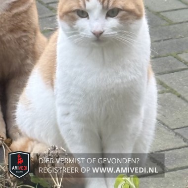 | Signalement | Wit met rood/oranje cyperse jonge kater. Rood/oranje cypers petje en oren, doorlopend vanaf de zijkant van het kopje tot aan de wangen. Witte bles, witte snoet en witte kin. Witte kraag. Witte borst, buik en pootjes. Op de rug cypers rood/oranje gestreept. Geringde rood/oranje staart. |