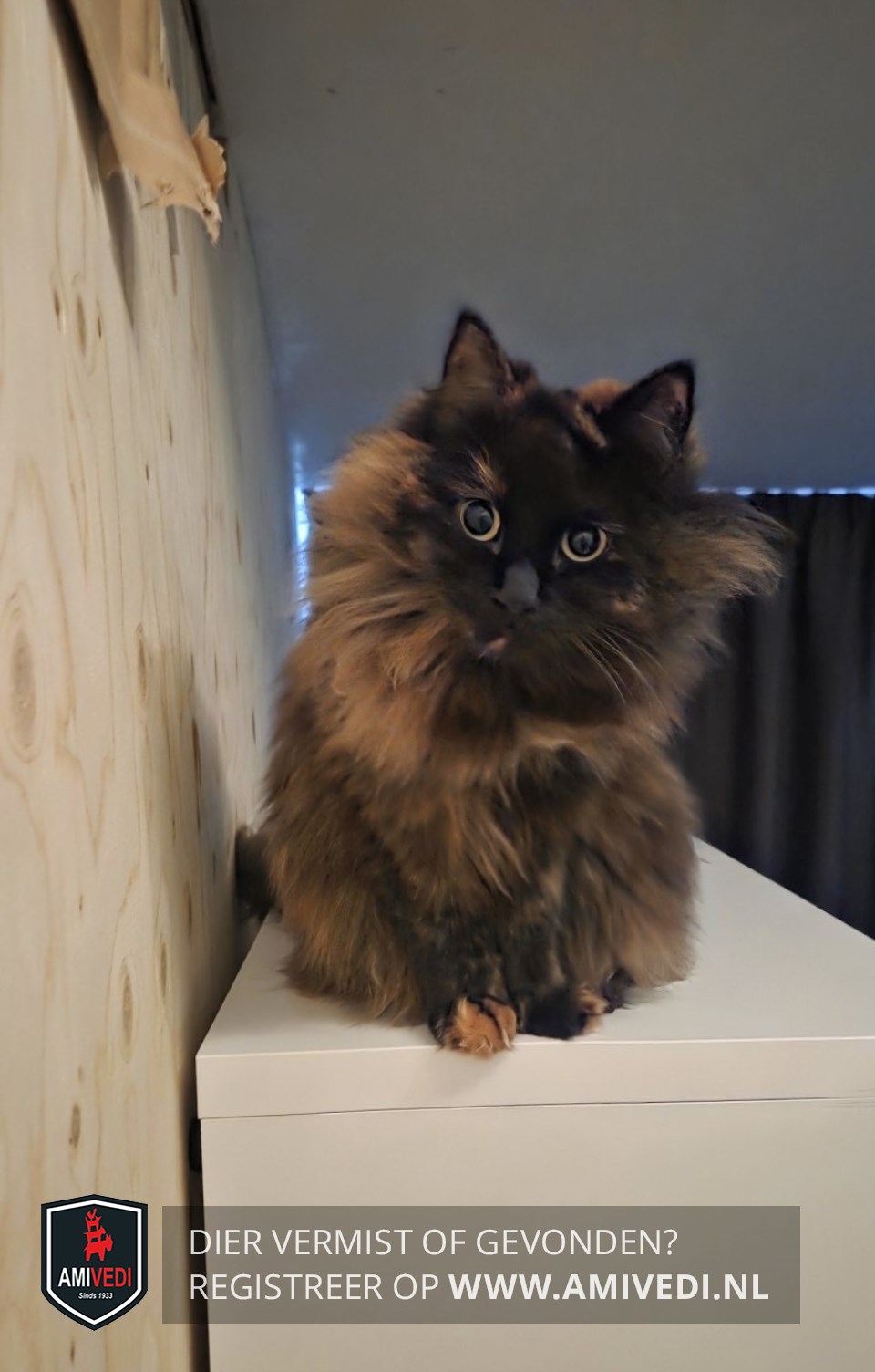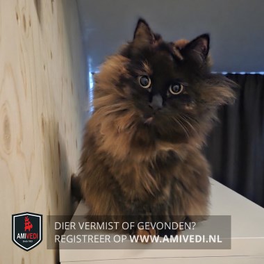 | Signalement | Schildpadpoes, langharig; kopje grotendeels zwart, op de rechterkant van de snoet ook rood; klein helderrood plukje op de onderlip/kin. Het lijf is donker met rood gemêleerd; aan de linkervoorpoot zwarte teentjes, aan de rechtervoorpoot oranje teentjes met daarboven voornamelijk zwart; de staart is bij de aanzet donker en meer naar het brede uiteinde toe ook rood. |