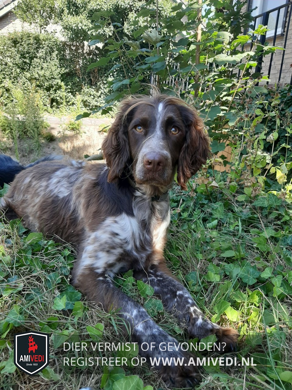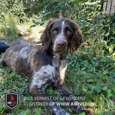 | Signalement | Bruine Spaniel, teef. Wit op de neusbrug en rond de spitse snuit. Hangende oren en licht bruine ogen. Rug en poten witt/bruin gevlekt. |