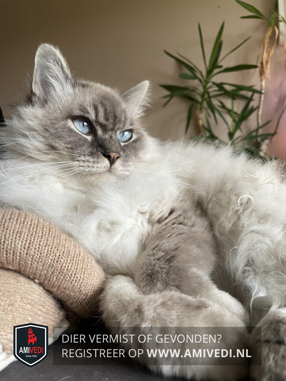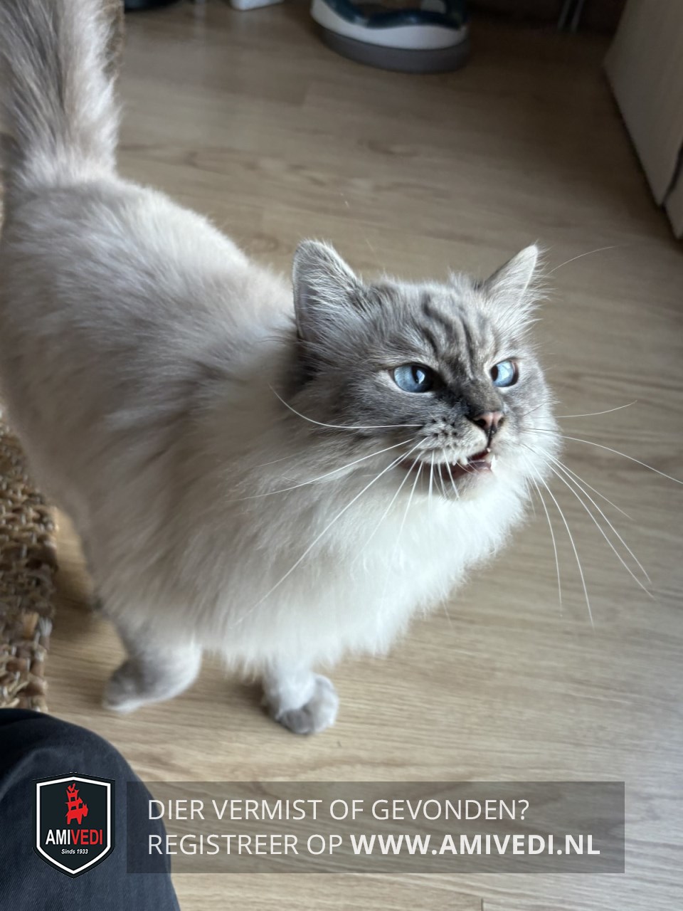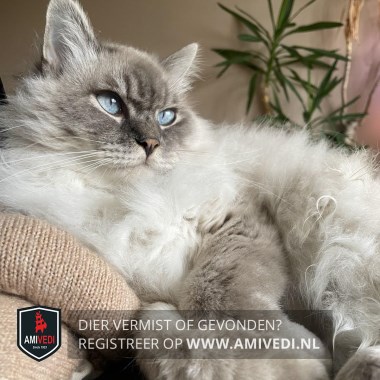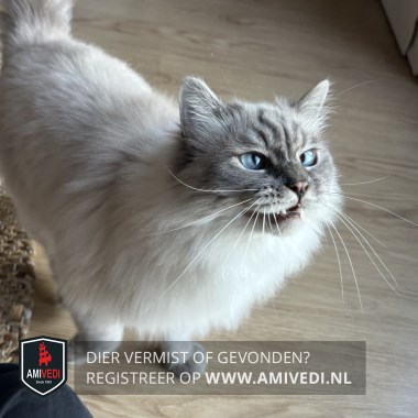 | Signalement | Ragdoll kater. Langharige, witte vacht met een cypers grijs kopje, grijze poten en staart. Weegt ong. 5,5 kg. Miauwt veel. BINNENKAT. |