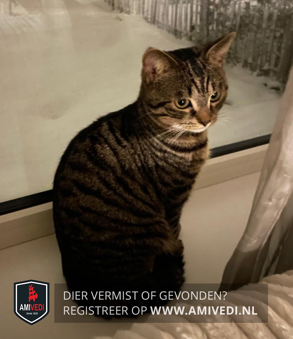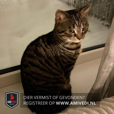 | Signalement | Cypers bruin/grijs/zwart katertje, licht randje om de oogjes, witte kaaklijn. Zeer klein katertje voor zijn leeftijd. |
