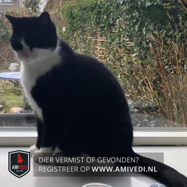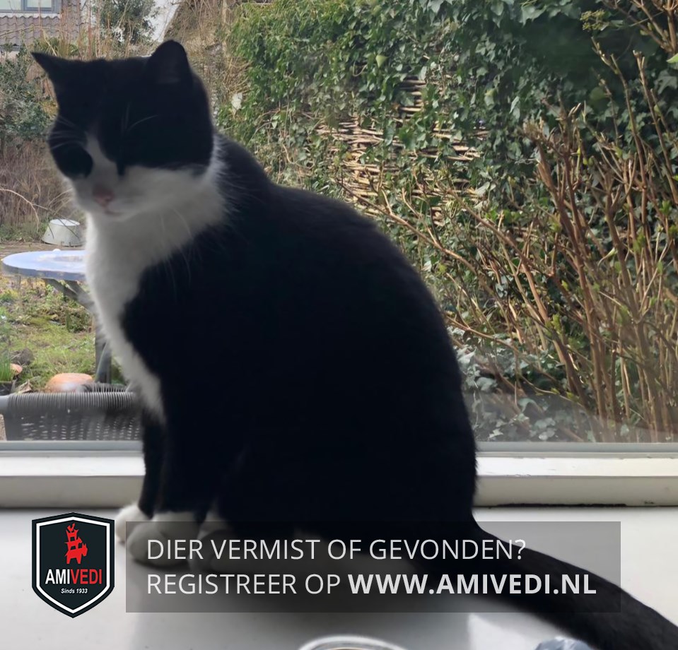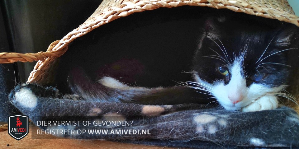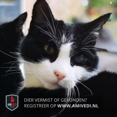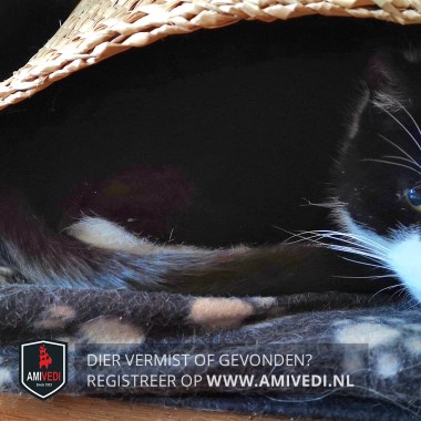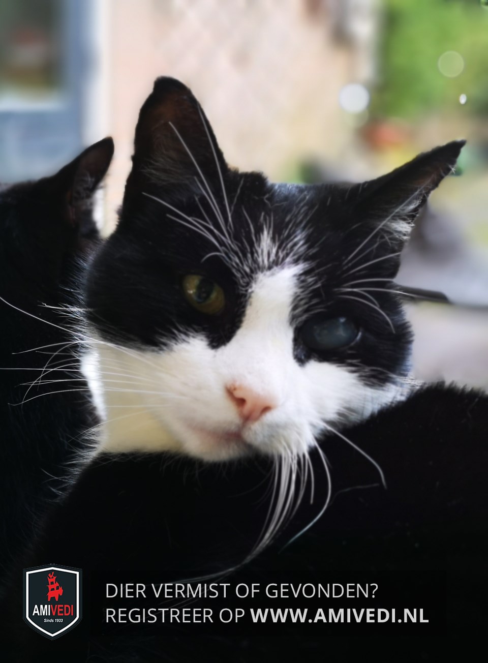 | Signalement | Zwart/witte senior kater. Zwarte kop, witte bles en witte snoet. Beschadigd linkeroor en blind aan het linkeroog. Witte kin, bef en borst. Zwart lijfje. Zwarte voorpootjes met witte voetjes. Witte laars aan de linkerachterpoot. Zwarte staart. |