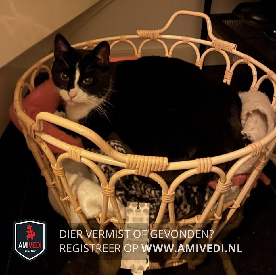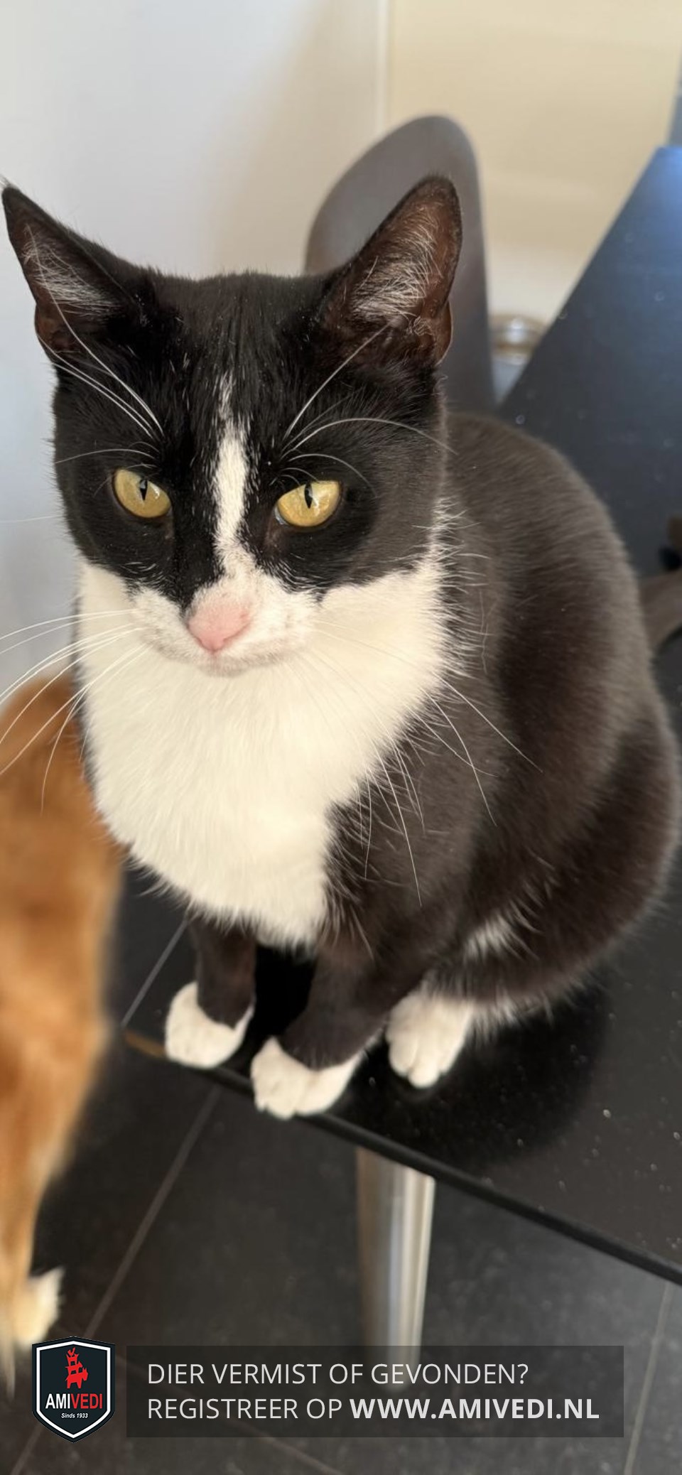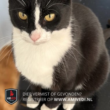 | Signalement | Voornamelijk zwart kat. Links over de neus een witte streep. Snuitje, kin, bef, borst en buik wit. Voor- en achterpootjes witte voetjes. |