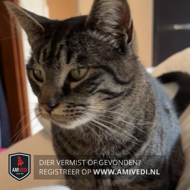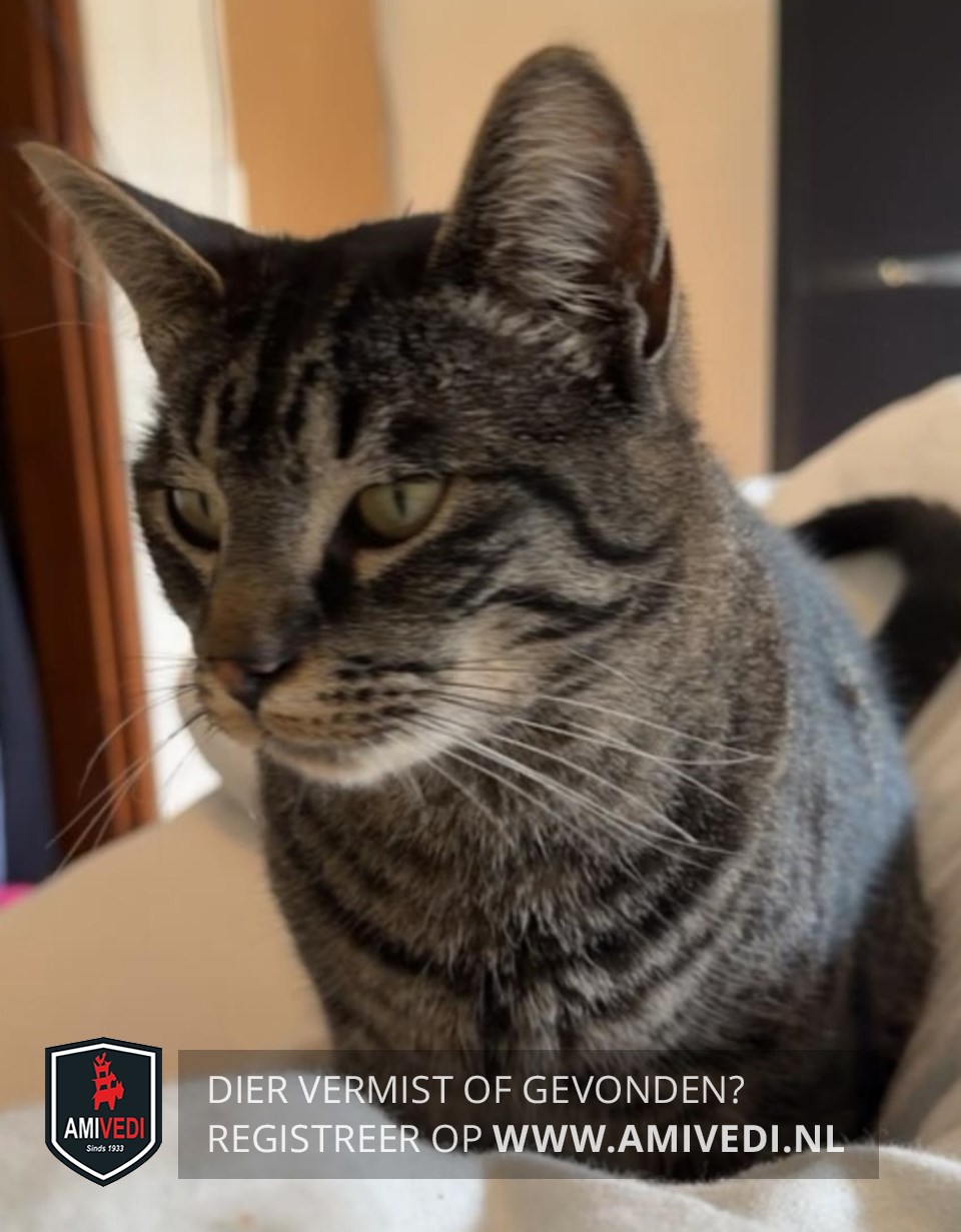 | Signalement | Cypers grijs/zwart gestreept, wit kinnetje. |