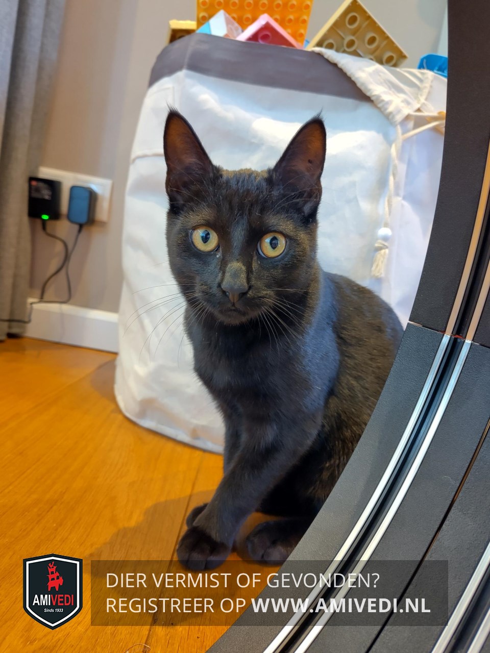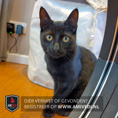 | Signalement | Zwart. Geel/bruine ogen. Paar losse grijze haartjes op de borst. Slank postuur. |