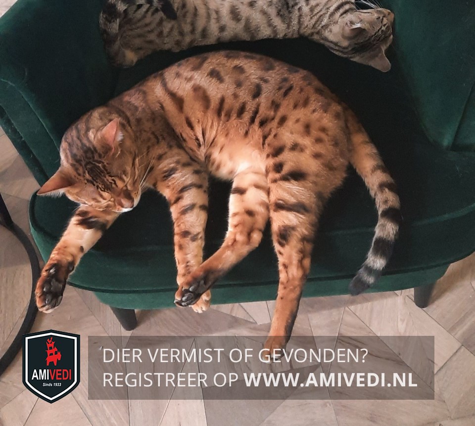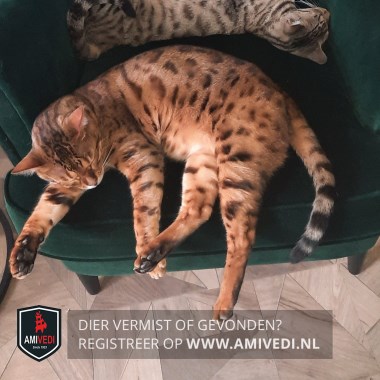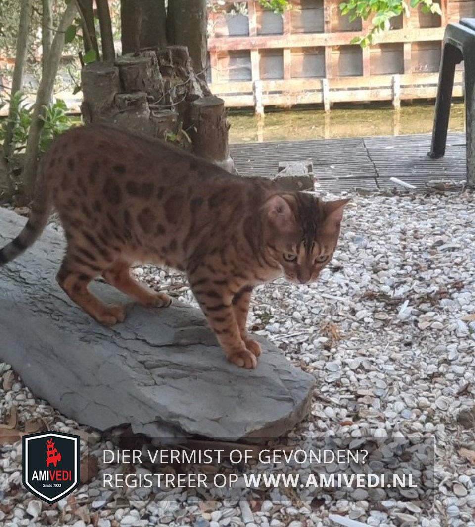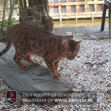 | Signalement | Ranke Bengaal, bruin met stippen heeft in zijn nek witte vacht. Hij kan wondjes hebben in zijn lies en buik. Dit komt door veelvuldig likken op dezelfde plek. |