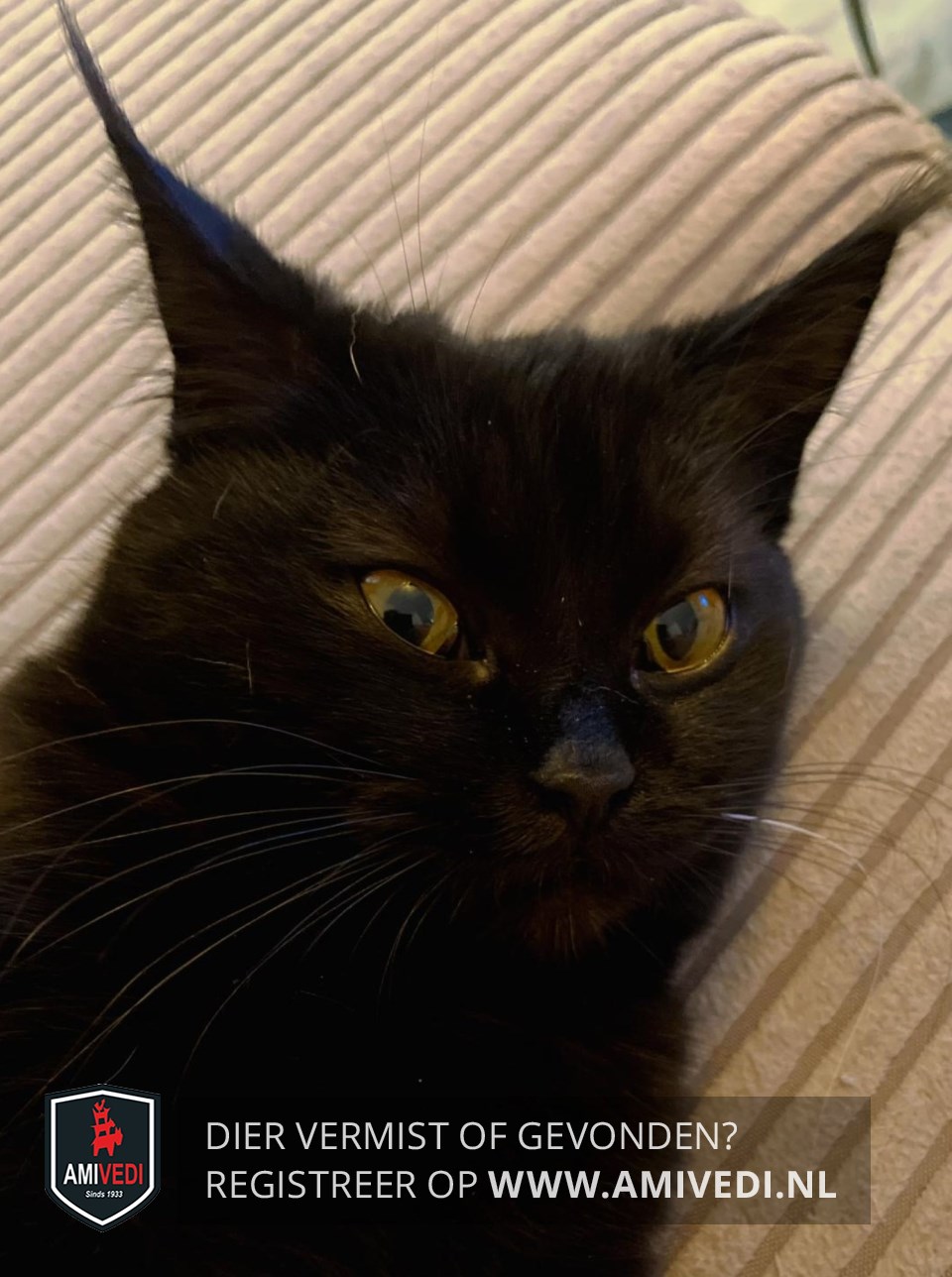 | Signalement | Europese korthaar kater, volledig zwart met een wit plukje bij z'n keel. Oren puntig met pluimpjes. |