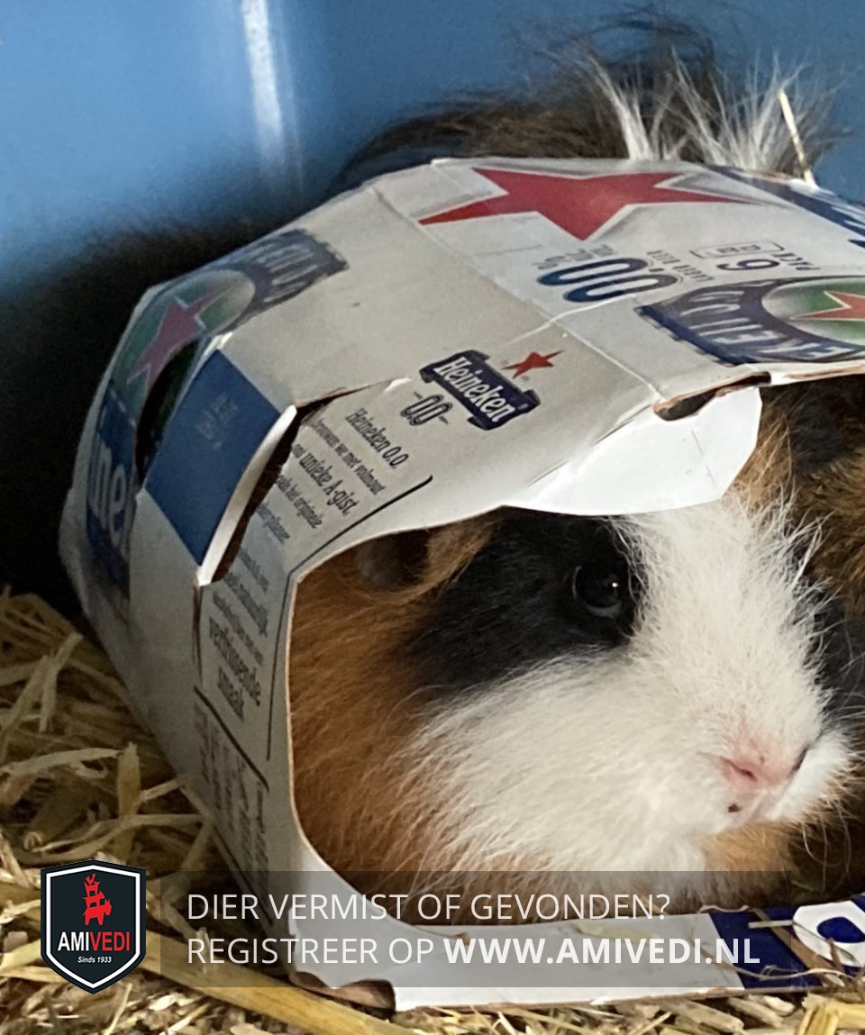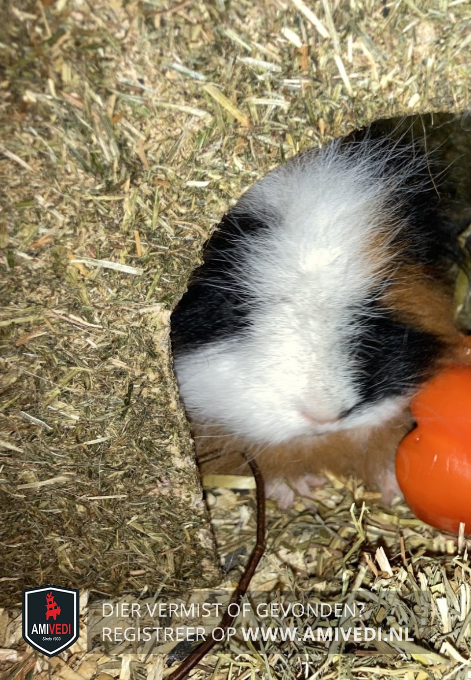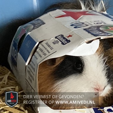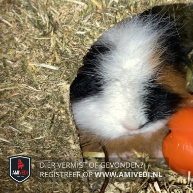 | Signalement | Meerdere kleuren bruin, rood, wit en zwart, half wit en half zwart/bruin kopje, midden op haar lijf zit een witte streep, licht in gewicht. |