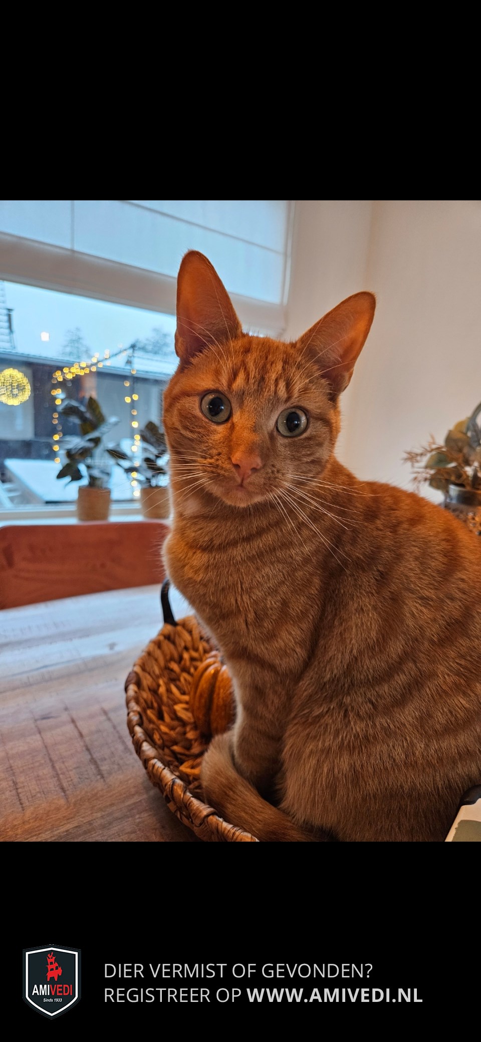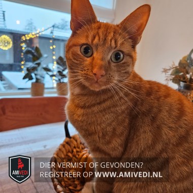 | Signalement | Cypers rood/oranje, klein wit vlekje op zijn hals/borst. |