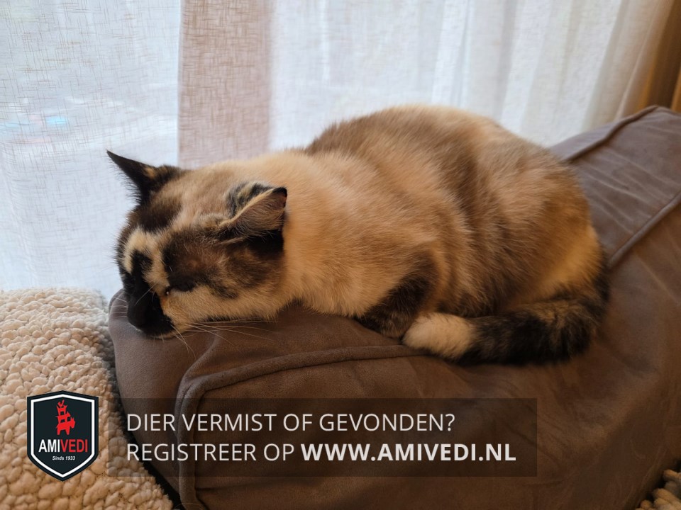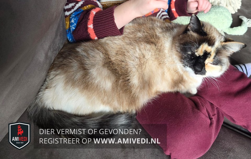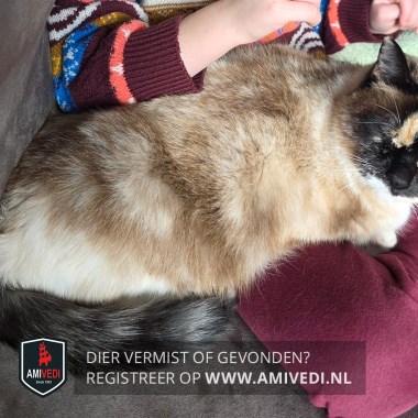 | Signalement | Lichte kleur lijf met donkere staart en donkere vlekjes op kopje. Blauwe ogen. |