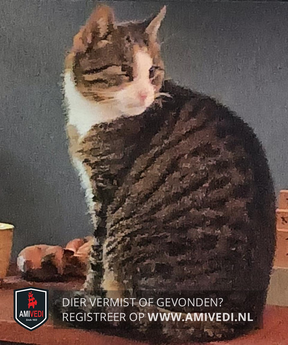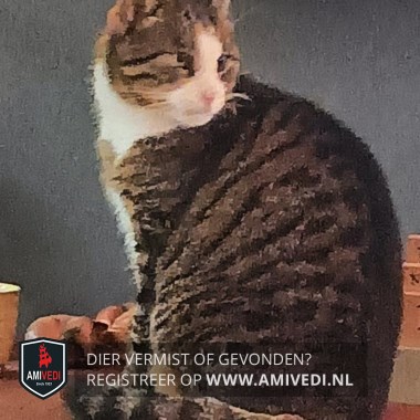 | Signalement | Cypers bruin/zwart gestreept met wit, witte neusbrug, wit bekje, witte bef en borst, beetje rood/witte pootjes, staart bruin/zwart gestreept |