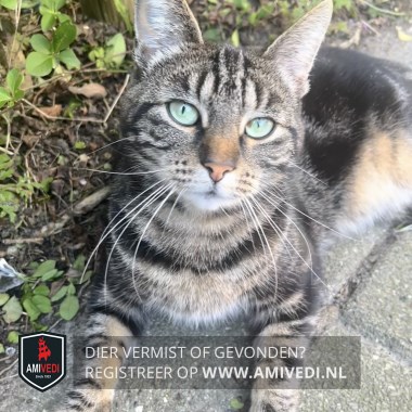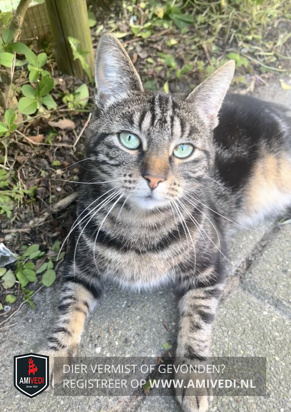 | Signalement | Cyperse bruin zwart gestreepte poes met wat wit rondom de bek. |