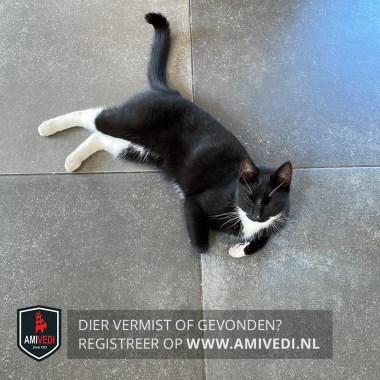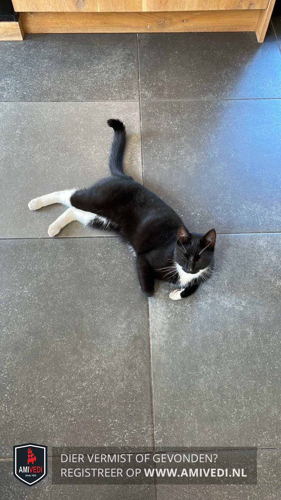 | Signalement | Zwart met witte kin en bef, voorpootjes witte teentjes en achterpootjes wit. |