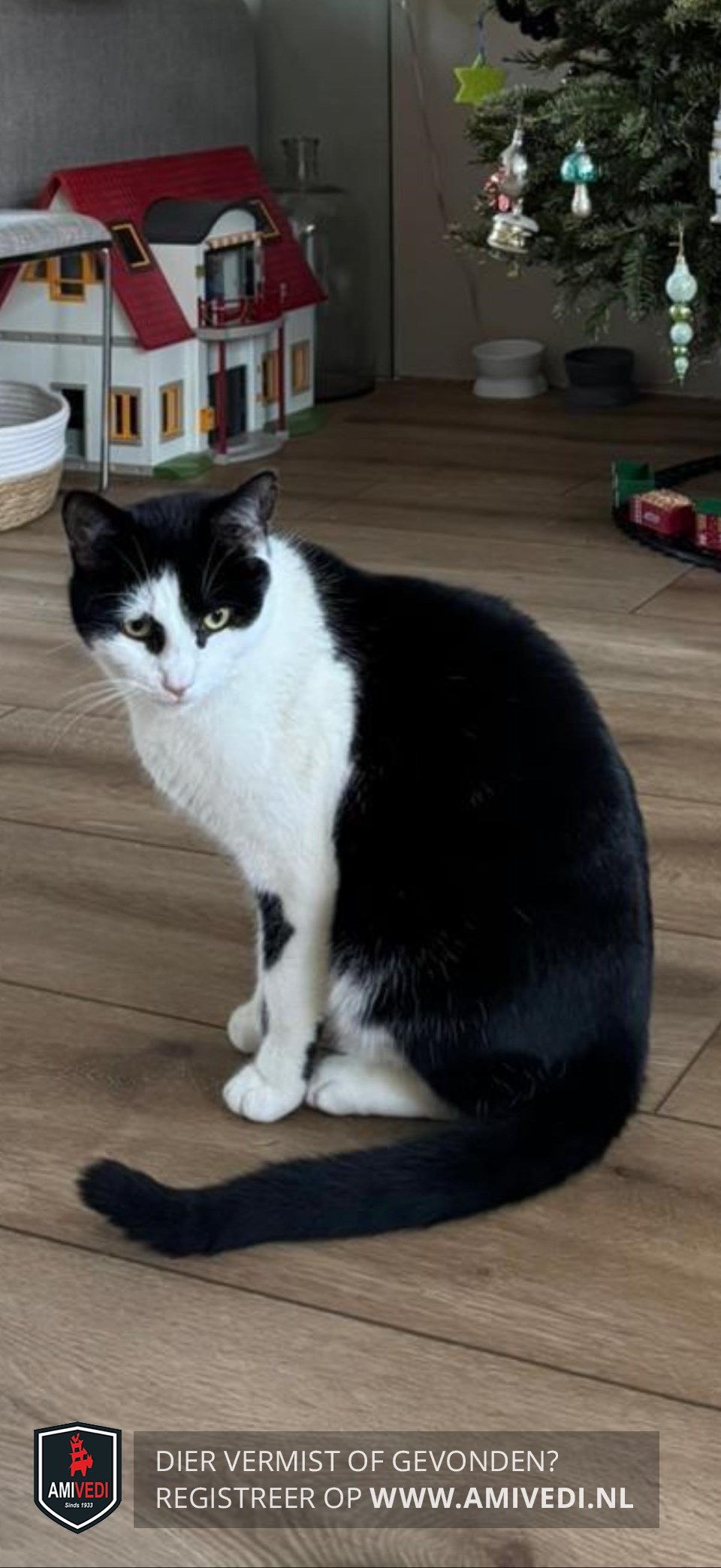 | Signalement | Zwart met rechterzijde kop wit tot boven het oog, links tot onder het oog, witte snuit, kin, kaaklijn, keel, kraag, bef, borst voorpoten (linksvoor zwarte vlek voorzijde een zwarte vlek en achterzijde linker voorpoot zwarte vlek), witte buik en witte laarzen. |