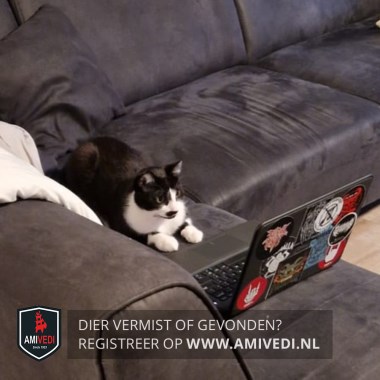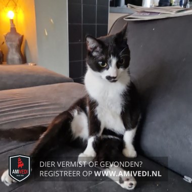 | Signalement | Witte haren in de oren, witte bles met rechts op de bles zwarte vlek met witte haren erin, de bels loopt door via de mond, naar de borst en buik, zwarte vlek rechts naast de neus doorlopend naar de zwarte neusspiegel, zwarte vlek op de kin, zwart-witte voorpoten, witte sokjes achter met zwart op de kussentjes, knikje in het puntje van zijn staart |