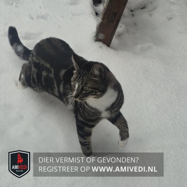 | Signalement | Cypers bruin/zwart met wit. Witte dunne streep tussen de ogen tot op de neus. Witte kin, bef en borst. Beide voorpoten witte voetjes. Rechter achterpoot wit sokje. Kop, rug, zijflanken en staart cypers bruin/zwart. Postuur mager en atletisch. |