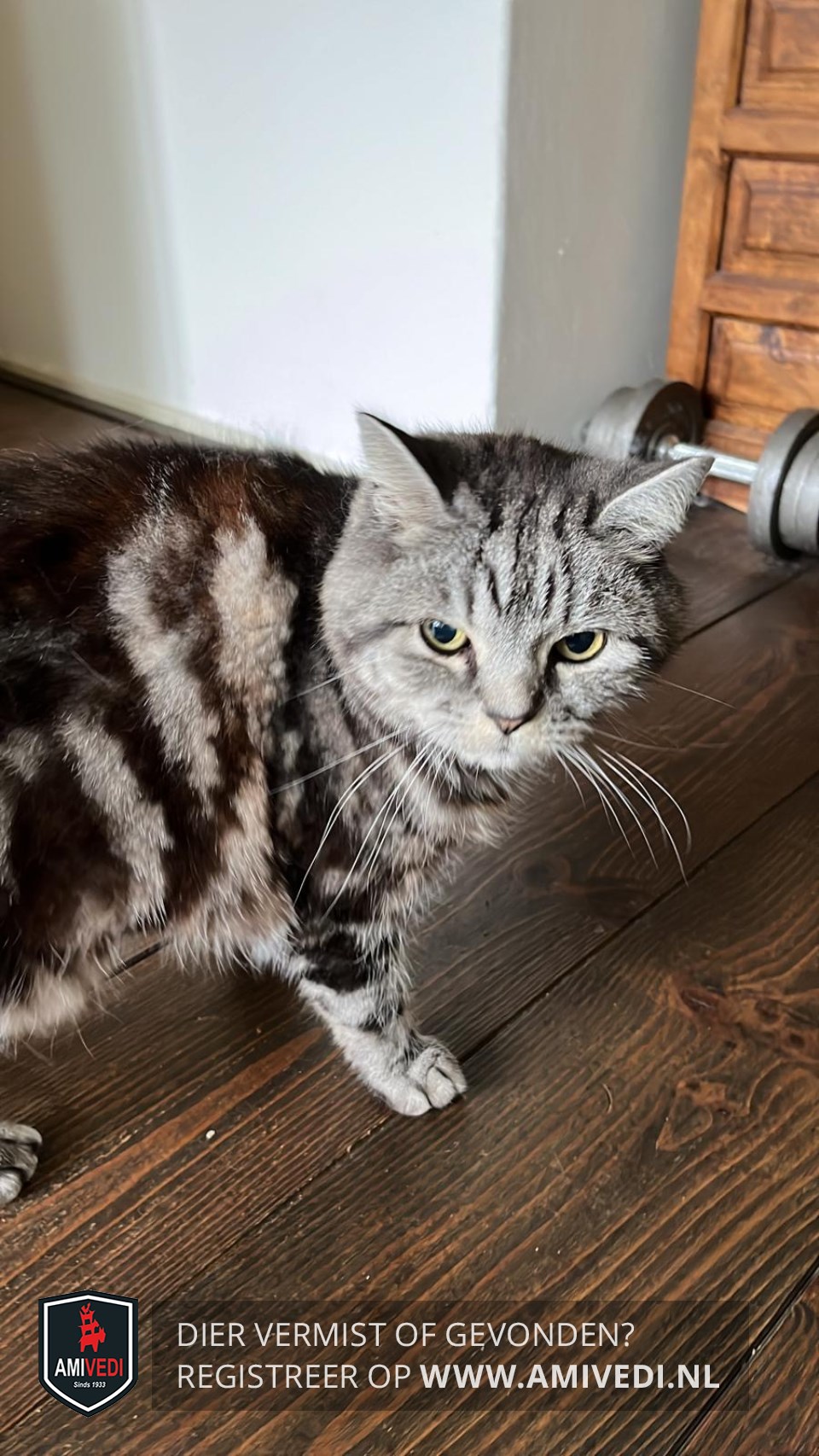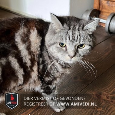 | Signalement | Grijs met zwart gestreept, gele ogen, grijs op rechter voorpoot, halflang haar. |