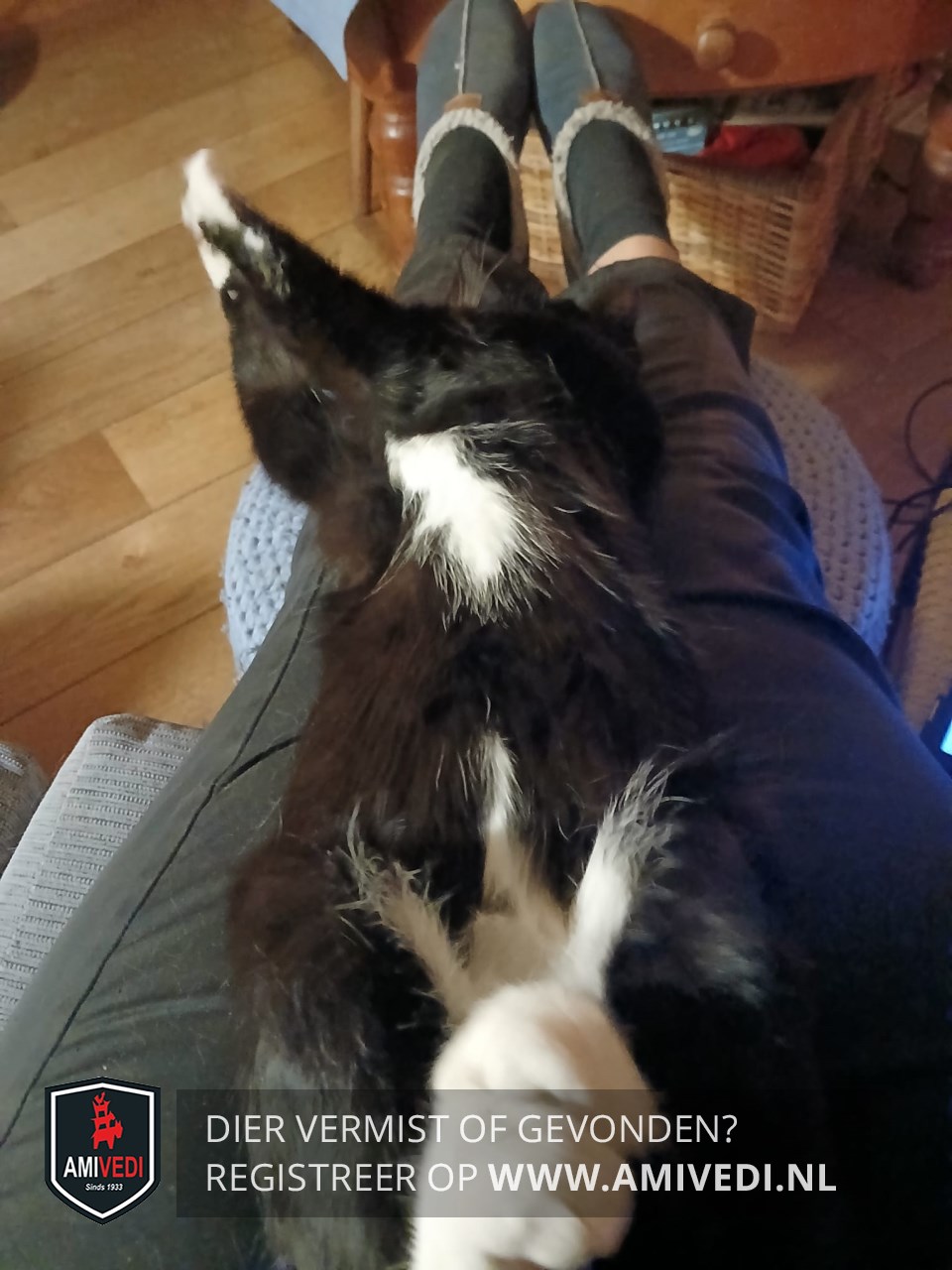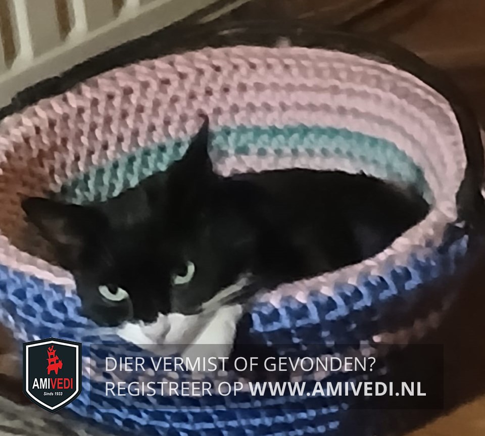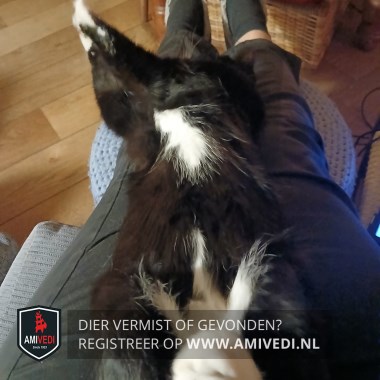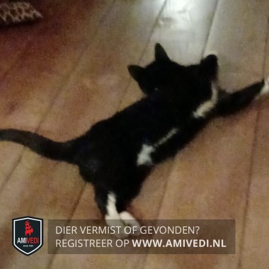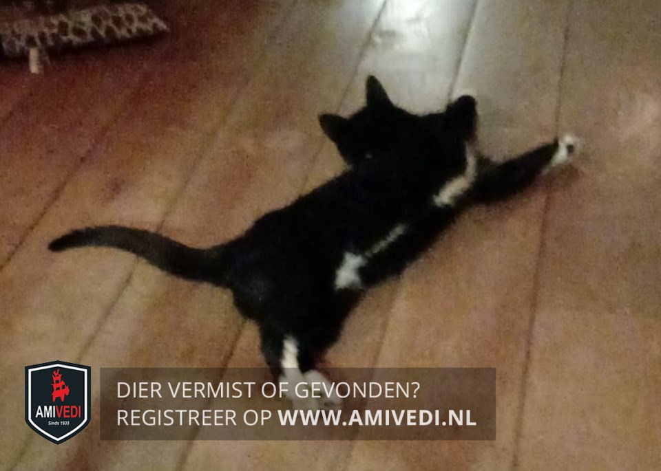 | Signalement | Zwart met witte snoet. Witte hals, bef. Wit op de buik tussen voor- en achterpoten. Voorpoten witte voetjes. Linker achterpoot witte voet. Rechter achterpoot wit kniekousje. Zwarte staart. |