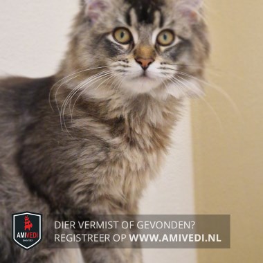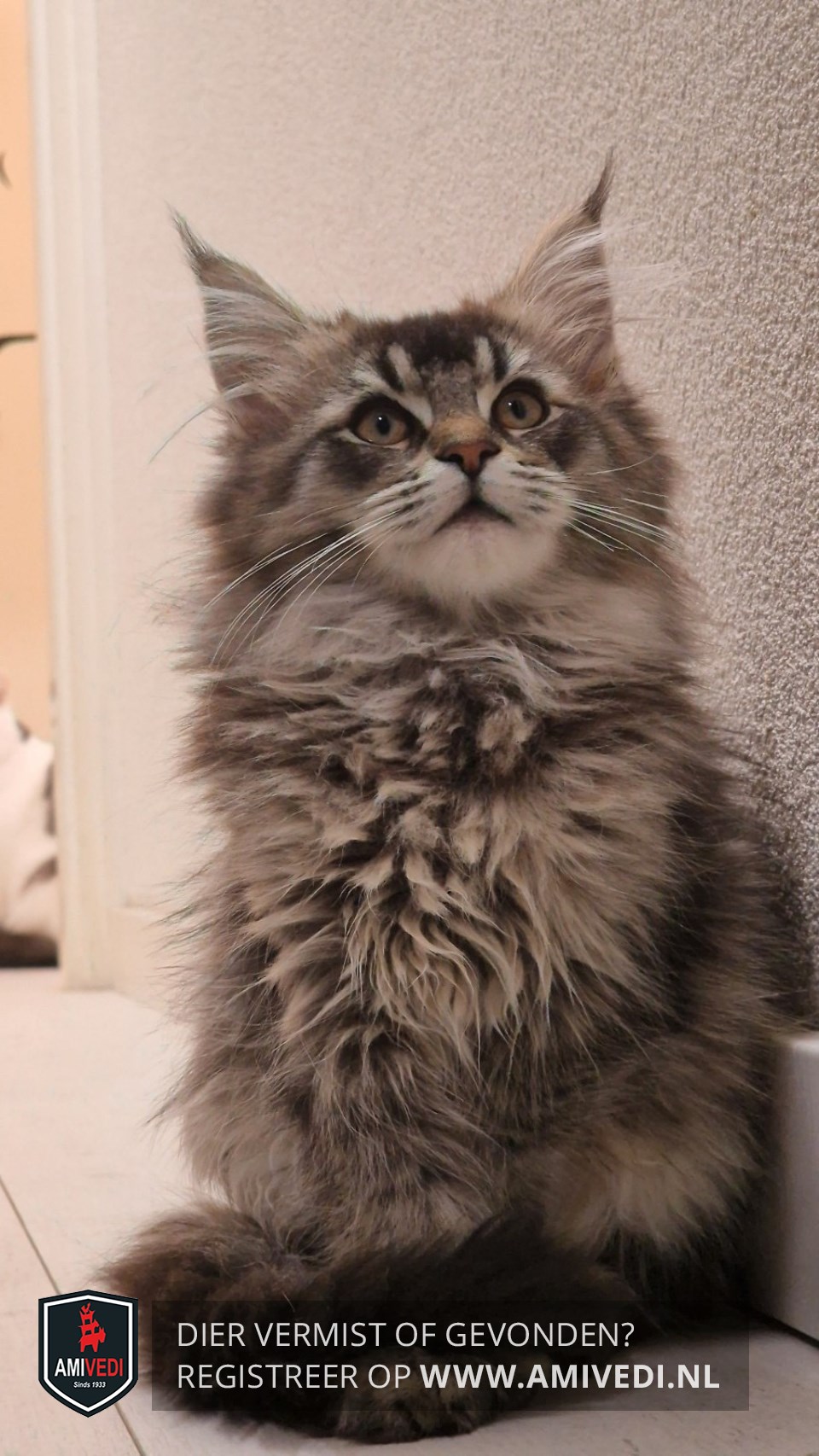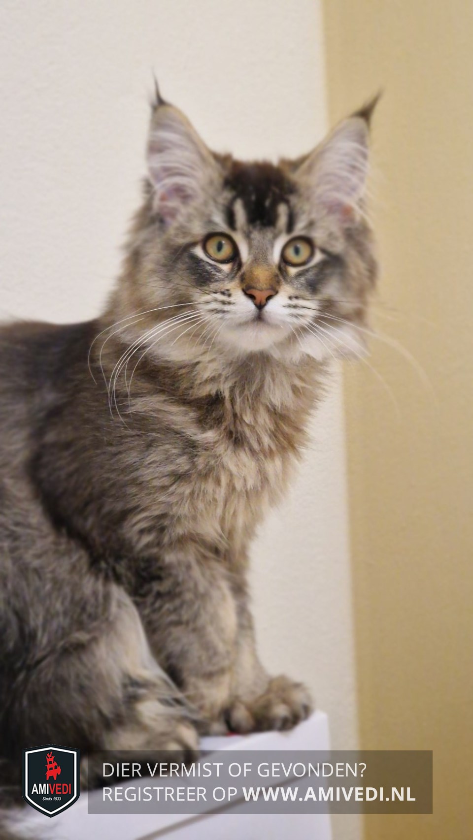 | Signalement | Gemarmerd/gestreept over het hele lichaam. Bovenop de kop zwart, inc de oren. Bovenop de oren zwarte pluimpjes. Wit rondom de mond en kin. Bij de aanhechting van de snorharen grijze stipjes. Ze heeft 6 teentjes, ze is polydactyl. |