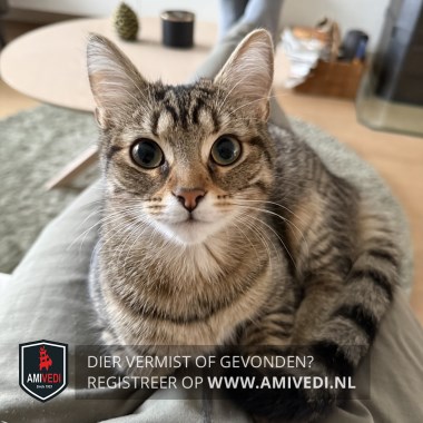 | Signalement | Grijs/zwart (gestreepte) poes met wit met een bruine ondertoon, wit naast de neus en bij de kin en bef, zwarte strepen over het hele lijf uitgesprokener bij de poten en de staart. |