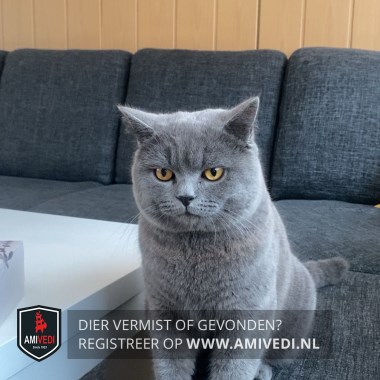 | Signalement | Geheel grijze kat met een wat rondere kop en gele ogen. |