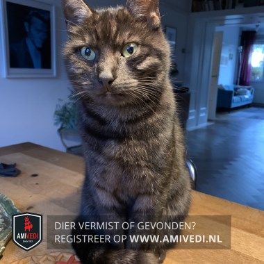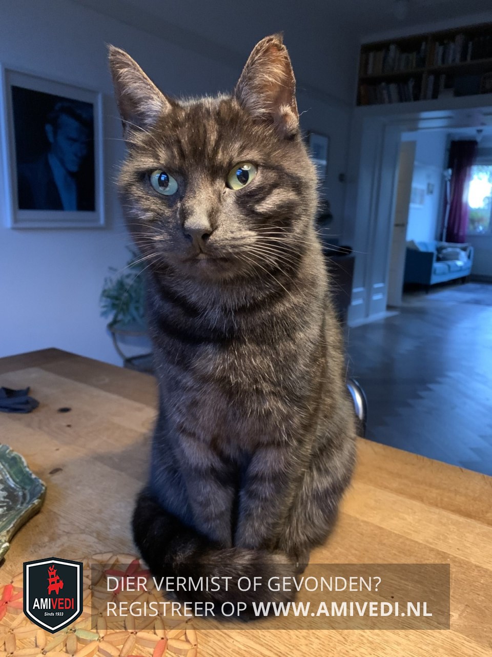 | Signalement | Grijs zwart cypers gestreepte kater met een licht streepje op zijn wang. |