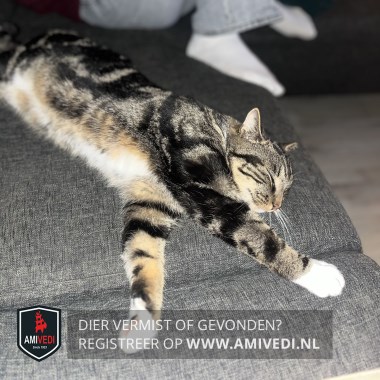| Signalement | Cyper bruin/zwart met wit. Kop, rug, zijflanken en staart zijn cypers. Witte kin, bef, borst en buik. Beide voorpoten witte voetjes. Beide achterpoten witte sokjes. |