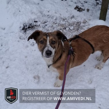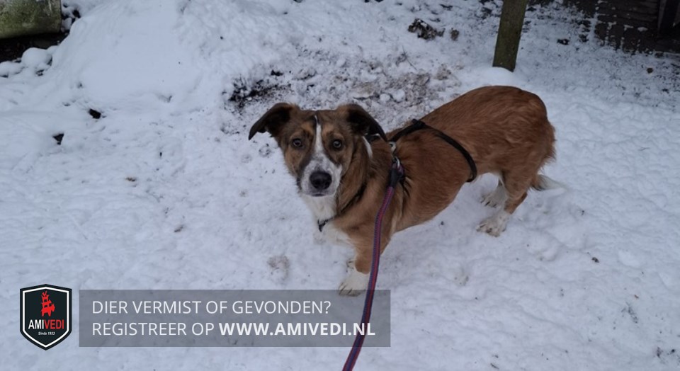 | Signalement | Kruising, bruin met wit. Witte snuit, hals, borst, sokken. Witte staartpunt. Schuw! |