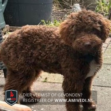 | Signalement | Italiaanse waterhond bruin met witte bef en witte voetjes voorpoten. |