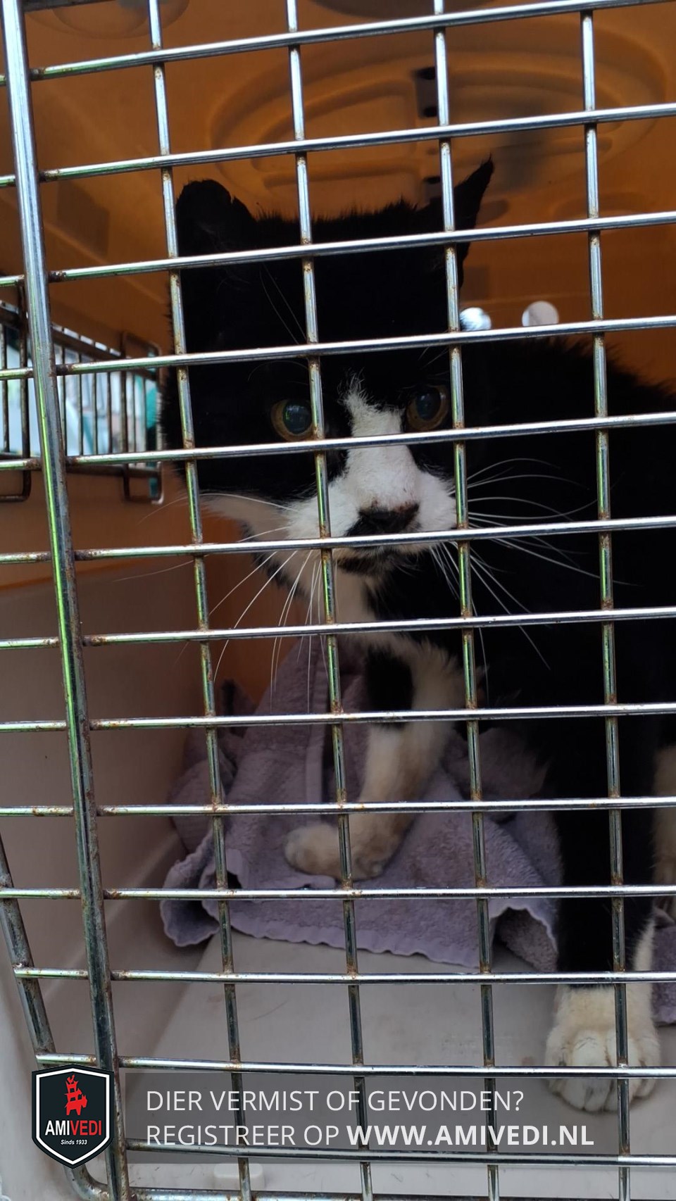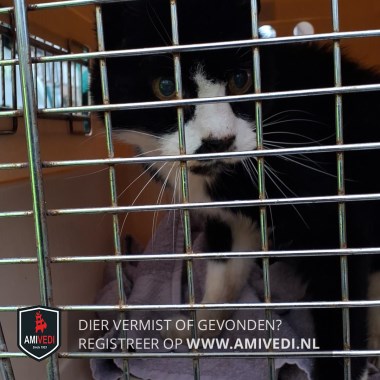 | Signalement | Zwart/witte kat. Zwart kopje dat doorloopt over en langs de oogjes. Wit neusje, zwarte vlek op het puntje van de neus en op de kin. Beetje witte wangen. Witte strook over de borst. Rechter voorpootje wit met een zwarte vlek bovenin. Linker voorpootje zwart met een wit sokje. Erg oud en mager. Geslacht opgevraagd. |