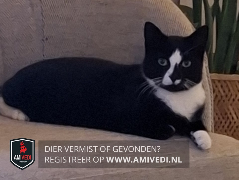 | Signalement | Zwart-witte kat; voornamelijk zwart met witte accenten: witte driehoek tussen/boven de ogen, deels witte neusbrug, zwart neusje, wit onder de neus. Zwarte kin, witte bef, witte voetjes aan de voorpoten met ook donkere kussentjes, witte kousen aan de achterpoten; witte snorharen |