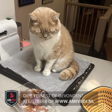 | Signalement | Cypers licht rood gestreepte Britse Korthaar met wat wit onder het oog en met een witte bef en onderkant, witte pootjes. Witte hals en een rood gestreepte rug met een rode geringde staart. |