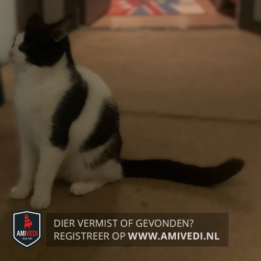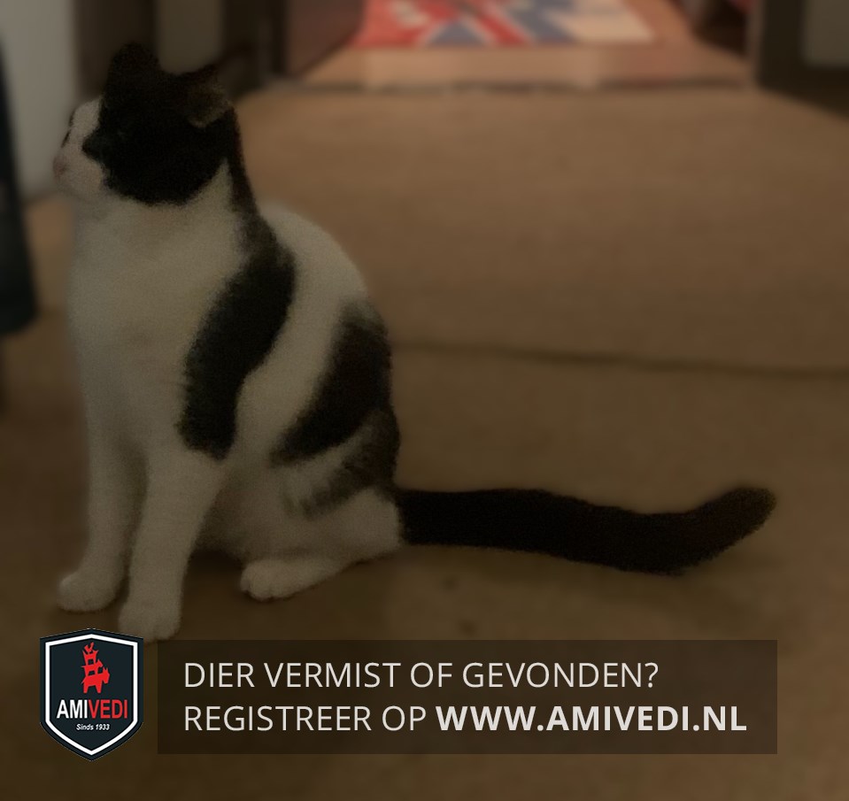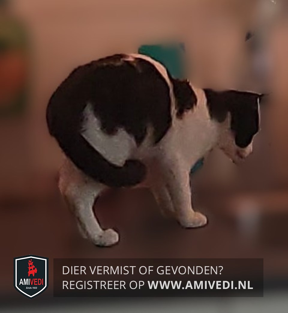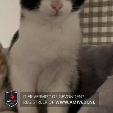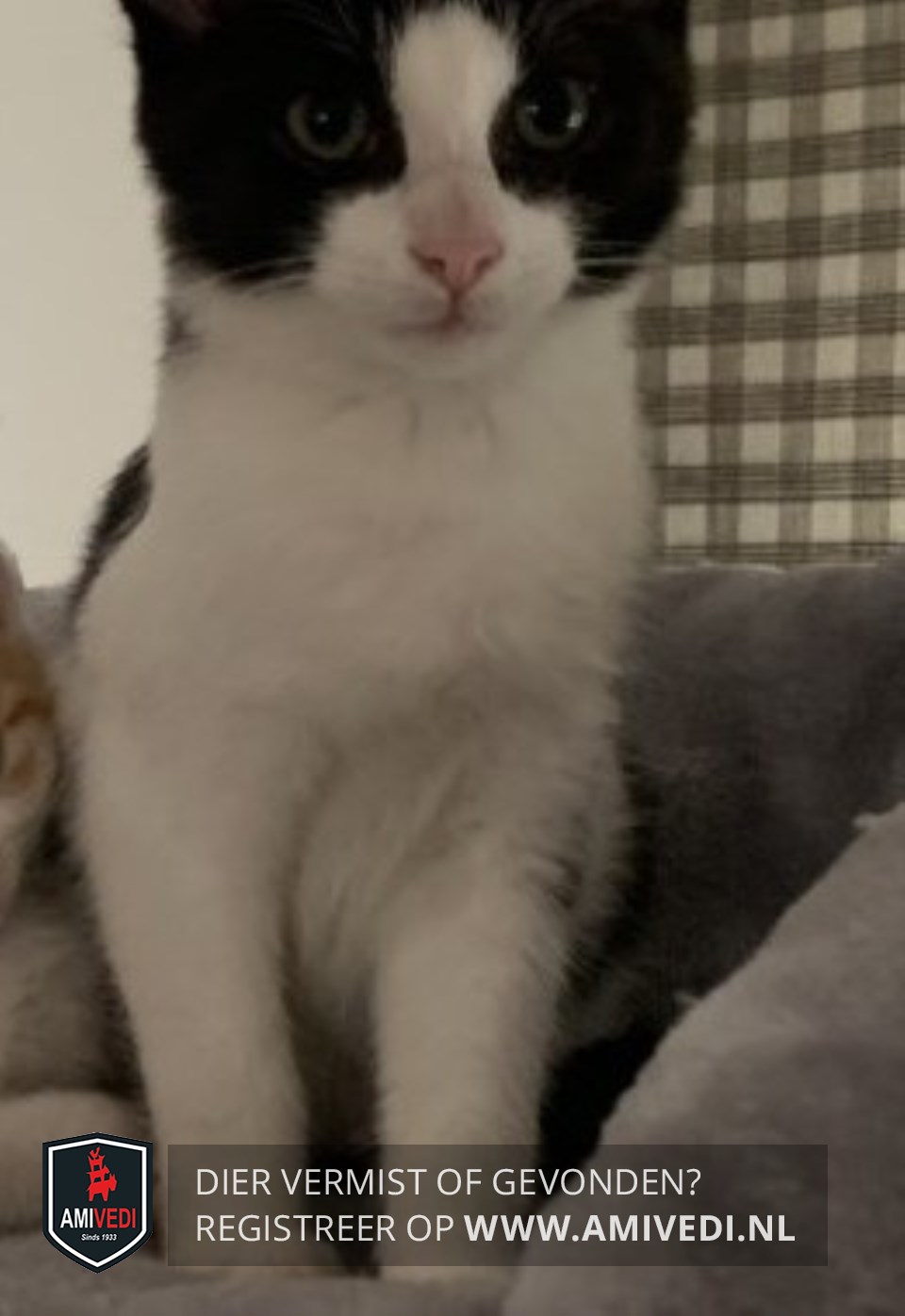 | Signalement | Kitten (m) wit. Kopje is grotendeels zwart, vanaf de wangen, rond de ogen en oren zwart. Op de rug enkele zwarte plekken. Zwarte staart. |