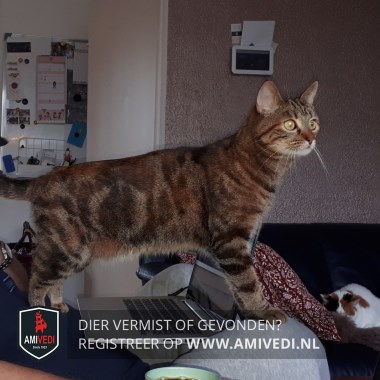 | Signalement | Bruin/grijs/beige Tabby. Beige onder de neus, kin. Bruine neus. Gestreept op de kop, hals, alle poten en staart. Grote vlek aan beide zijdes ter hoogte van de buik. |