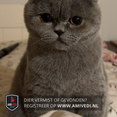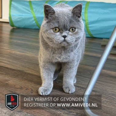 | Signalement | Grijze jonge kater. Tranende ogen. |