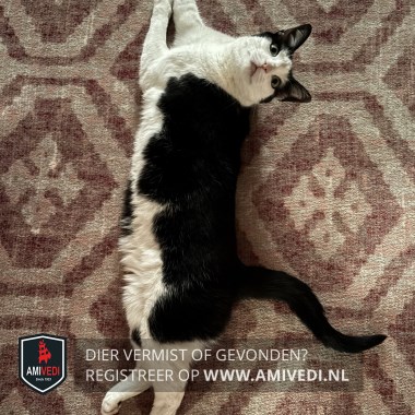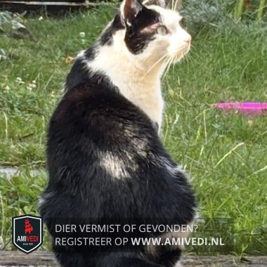 | Signalement | Poes klein van stuk, met zwarte vacht boven en wit onder. Witte voorpoten, buik en bef. Zwarte oren en witte bles , snuit , onderkant en witte pootjes met een zwarte staart . |