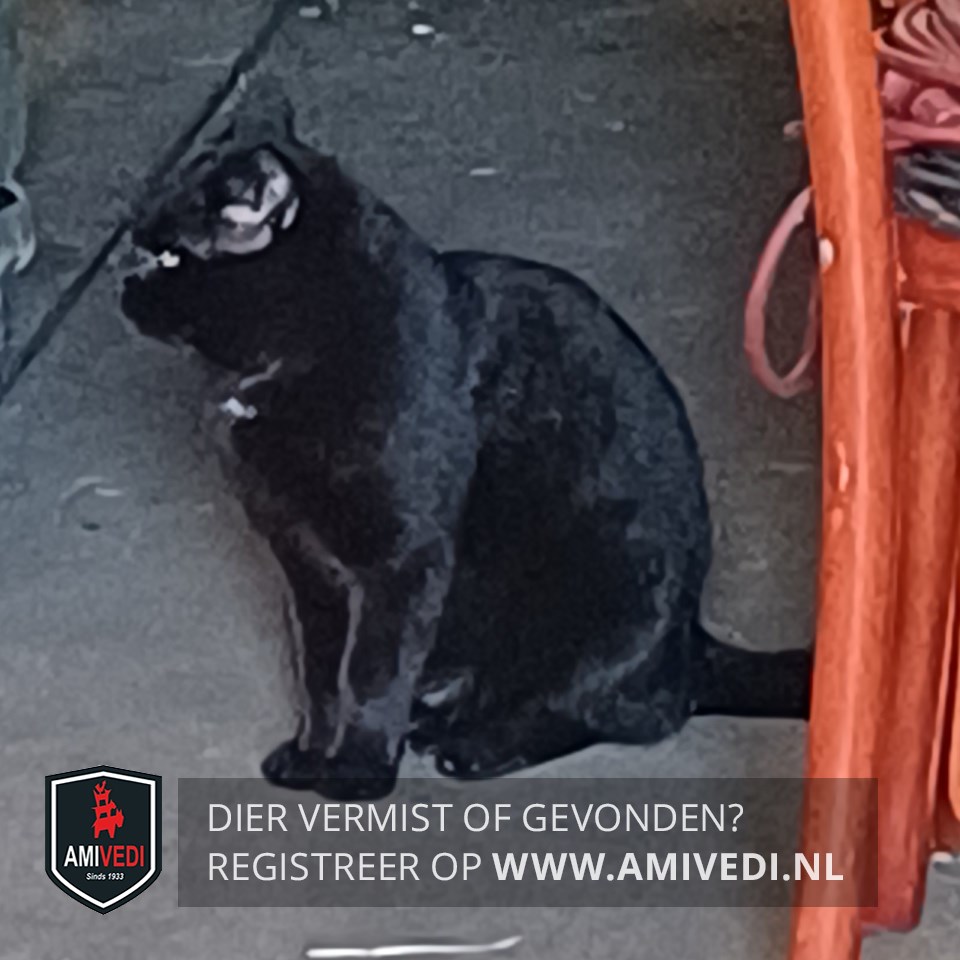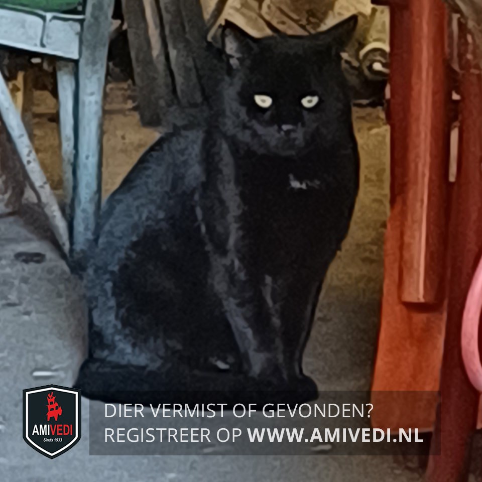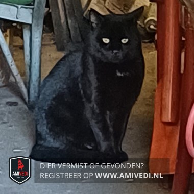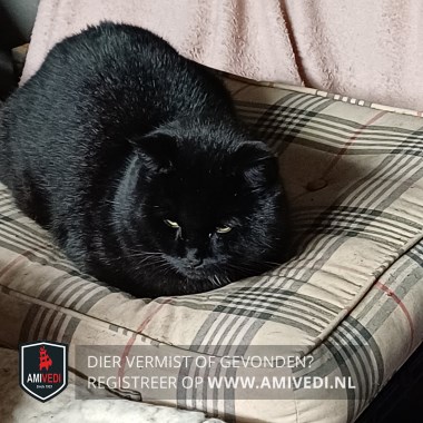 | Signalement | Zwart stevige kater met bolle kop en een heel klein beetje plukje wit op zijn borst. |
