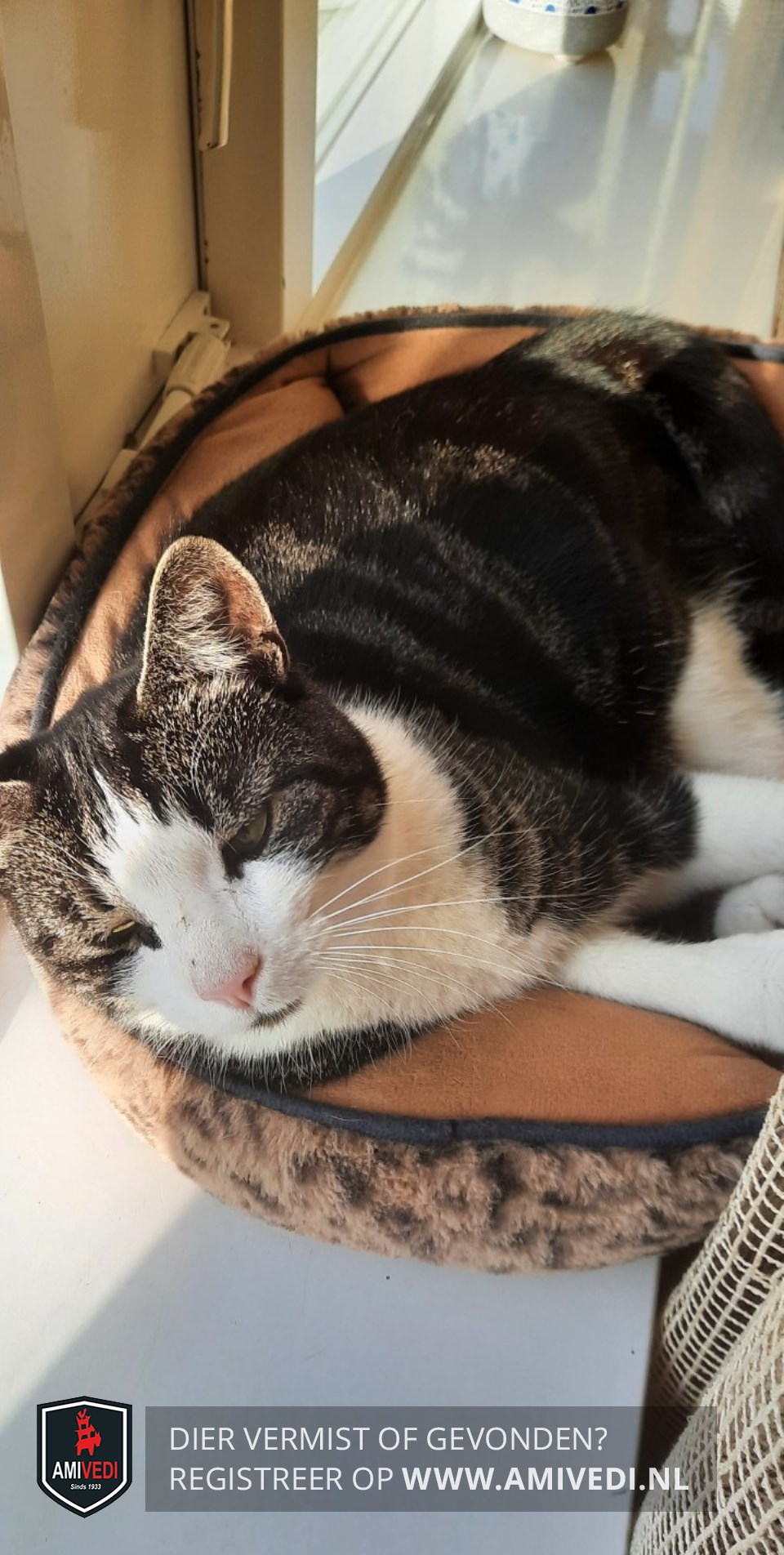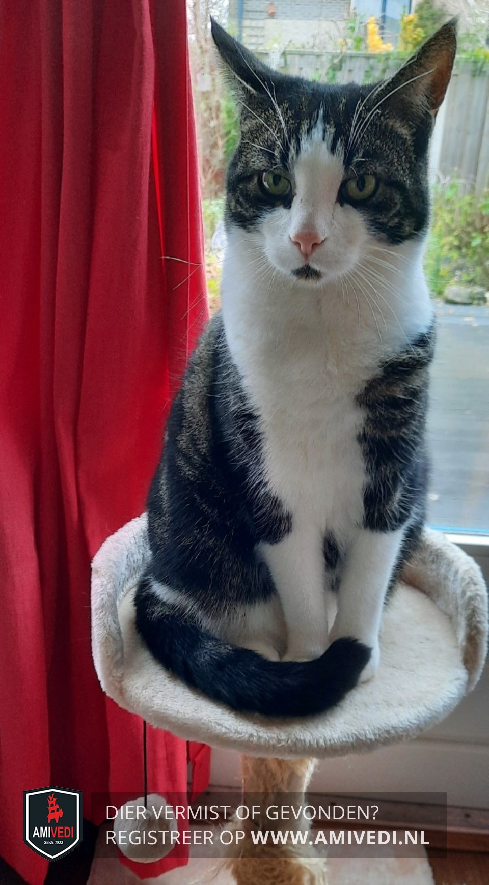 | Signalement | Diepdonkerbruine/grijs/zwarte vacht met cyperse strepen, brede witte sjaal om de nek, witte neus en snoet, roze neuspunt, lange witte bef/borst, donker vlekje op de kin. Witte pootjes. Grote kater, schuw, ca. 5 kilo. |