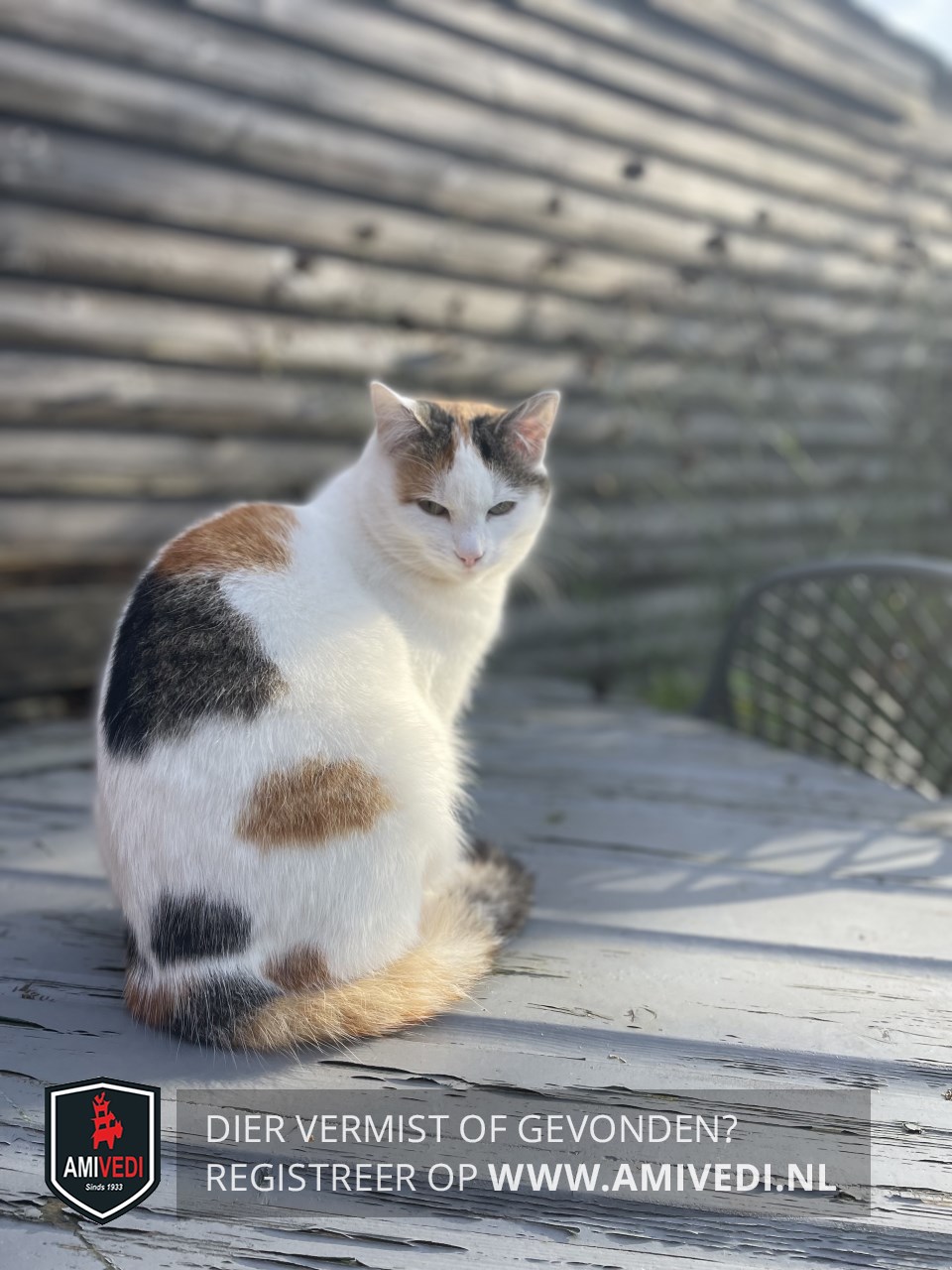 | Signalement | Wit met grijs naast de oren, rood op de achterkant van de kop en boven het rechter oog, boven op de rug een rode en grijze vlek, op de rechter zijkant een rode ovale vlek, op de kont twee grijze en een rode vlek, zwart/rood/bruine gemêleerde staart. |