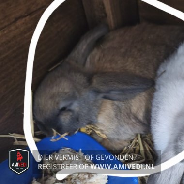 | Signalement | Bruin/grijs dwerg hangoorkonijntje (11 weken). Kop en oren voornamelijk grijs, lijfje vooral bruin. |