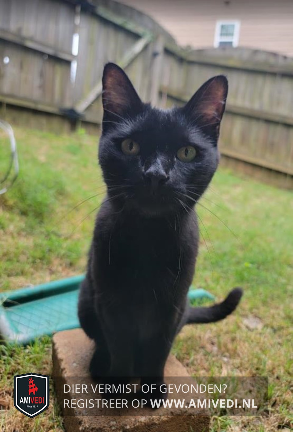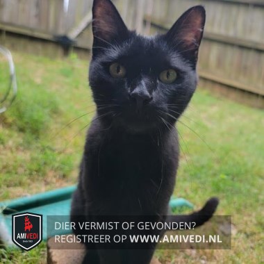 | Signalement | Volledig zwart poesje met gele ogen. |