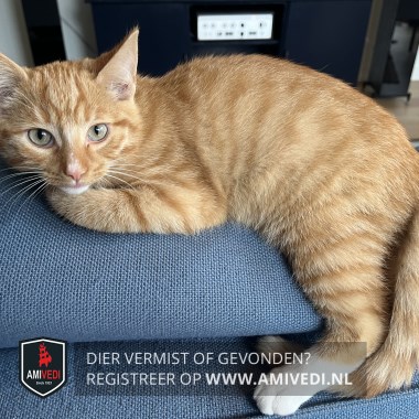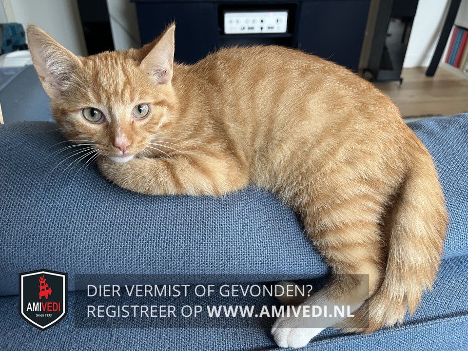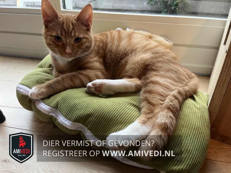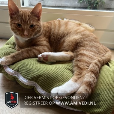 | Signalement | Cypers rood katertje, roze neuspunt met wat wit op de neus. Wit op de kin, witte snorharen, voorpootjes witte teentjes, achterpootjes witte kniekousjes. |