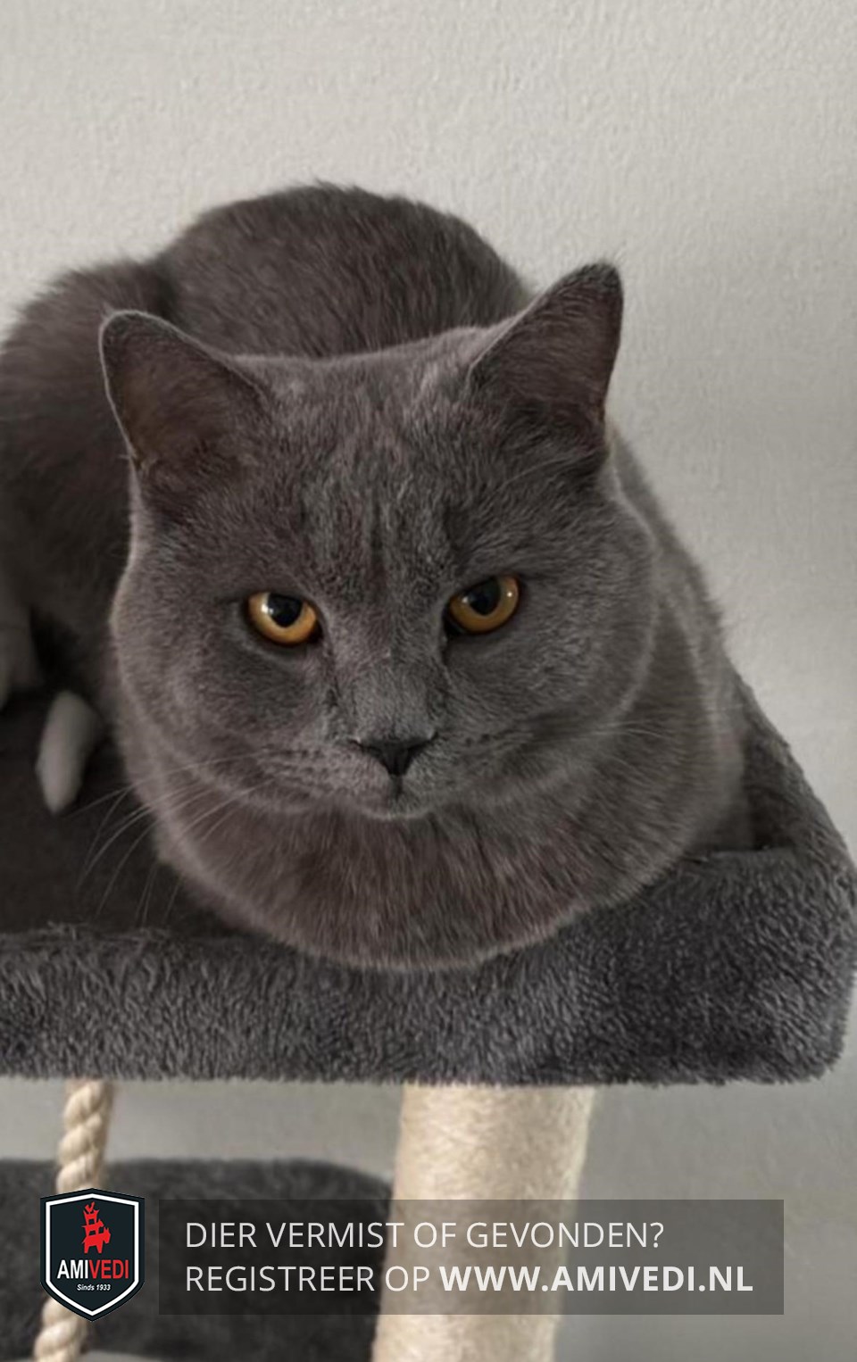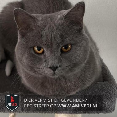 | Signalement | Brits korthaar kater, volledig grijs met amberkleurige ogen. |